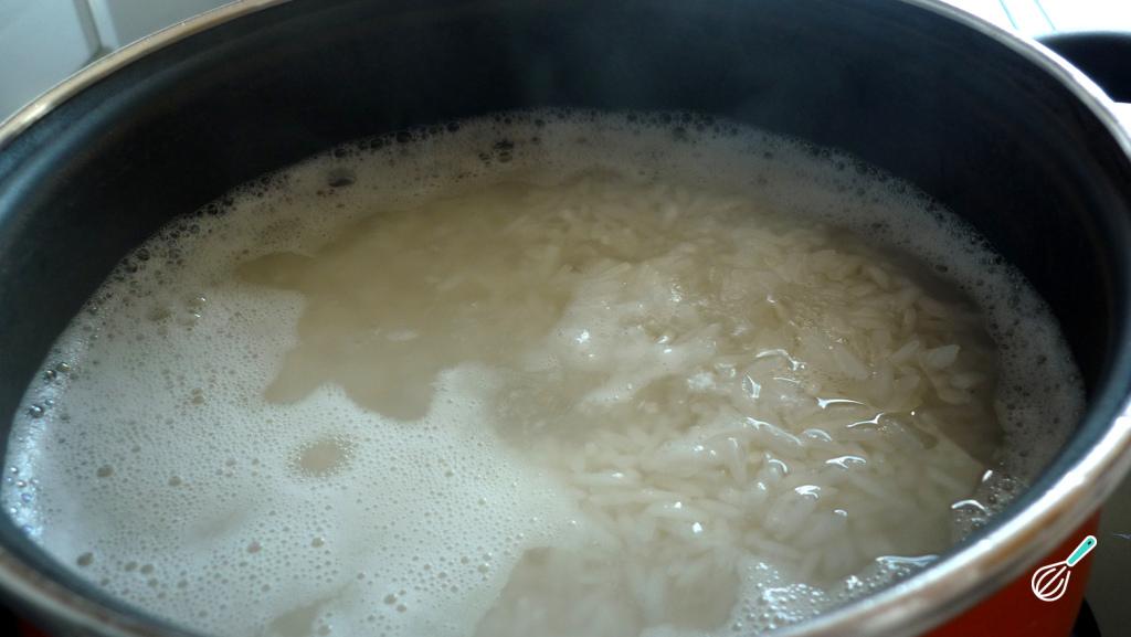 Coloque o arroz com o restante tablete de caldo de galinha em uma panela e junte quatro xícaras de água quente. Deixe cozinhar por 15 minutos, aproximadamente.