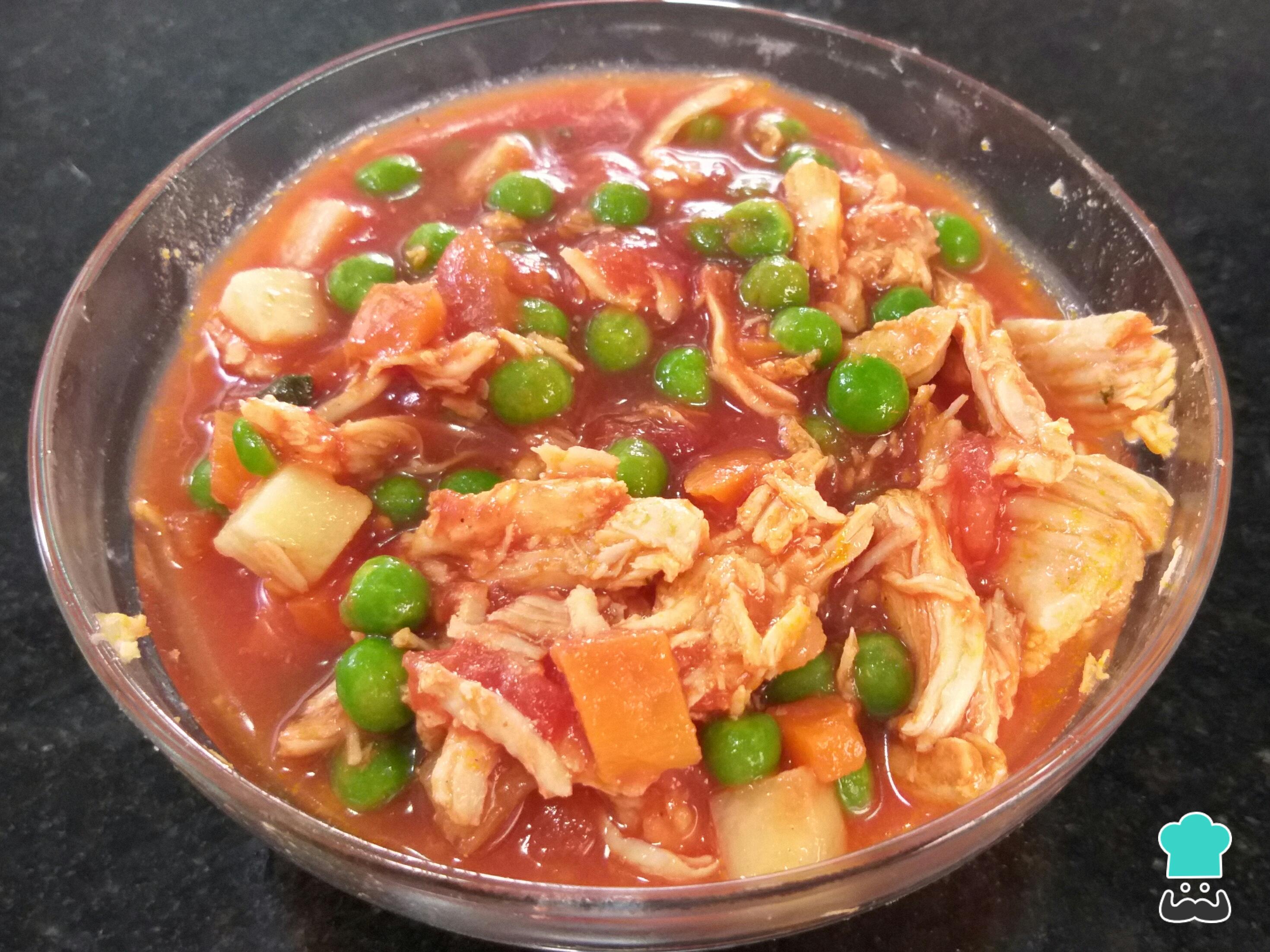Desfie o peito de frango e misture com a seleta de legumes e o molho de tomate.