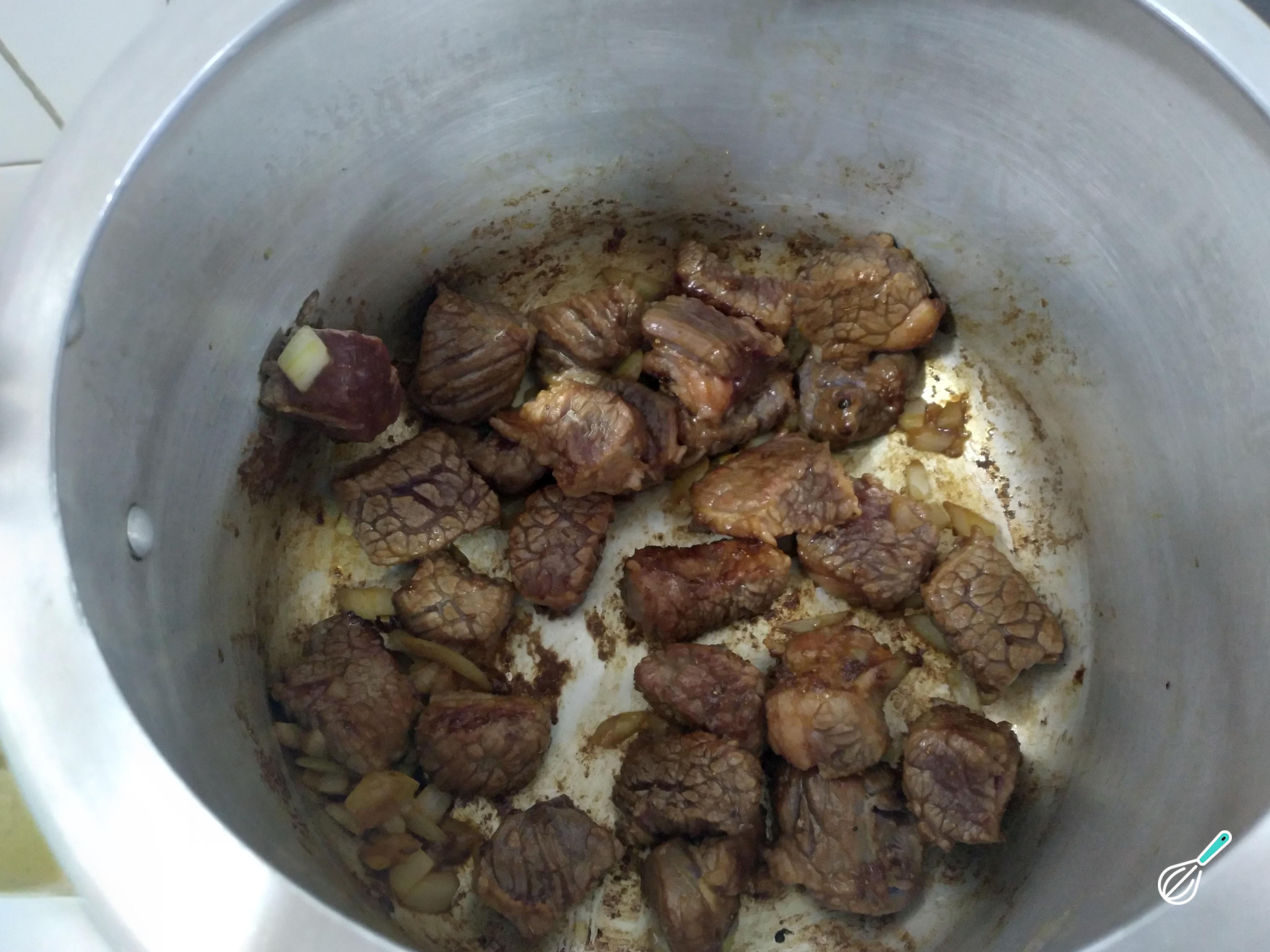 Feito isso, em uma panela de pressão, coloque 3 colheres de óleo de soja e coloque a carne. Coloque os temperos de sua preferência, sal e pimenta a gosto. Refogue a carne e depois de refogada, acrescente a cebola branca picada. Deixe refogar mais um pouco e incorporar os sabores. Depois disso, cubra a carne com água e tampe a panela. Depois que pegar pressão, marque 30 minutos. Assim que acabar o tempo, desligue o fogo e deixe a pressão sair naturalmente.