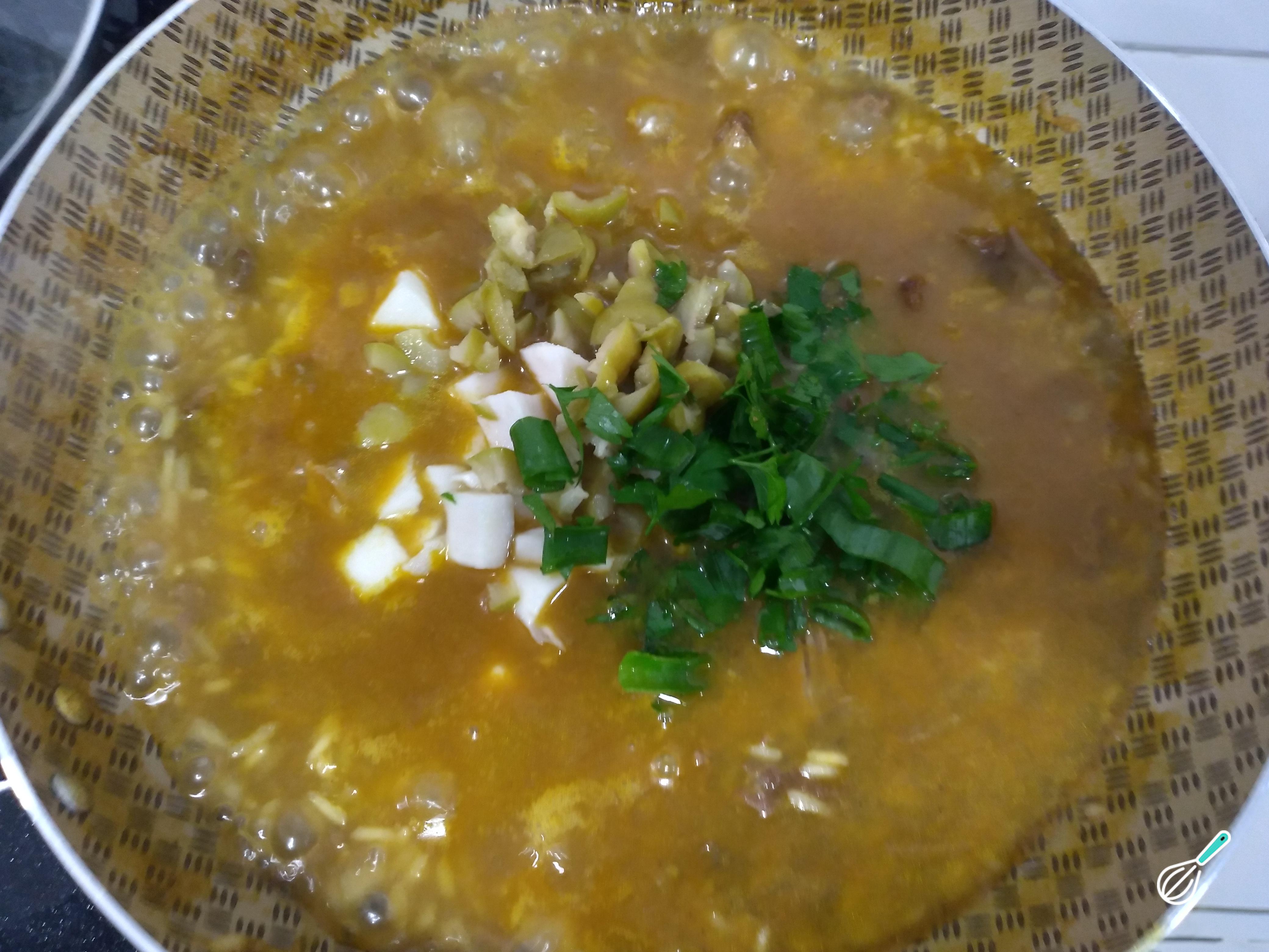 Depois que secar a água, experimente o arroz e, se for necessário, acrescente mais água. Acrescente o palmito picado, as azeitonas e a cebolinha e salsinha. Mexa para que não grude no fundo da panela. Deixe cozinhar mais. Prove e ser for necessário acerte o sal. Assim que secar completamente a água, desligue o fogo.