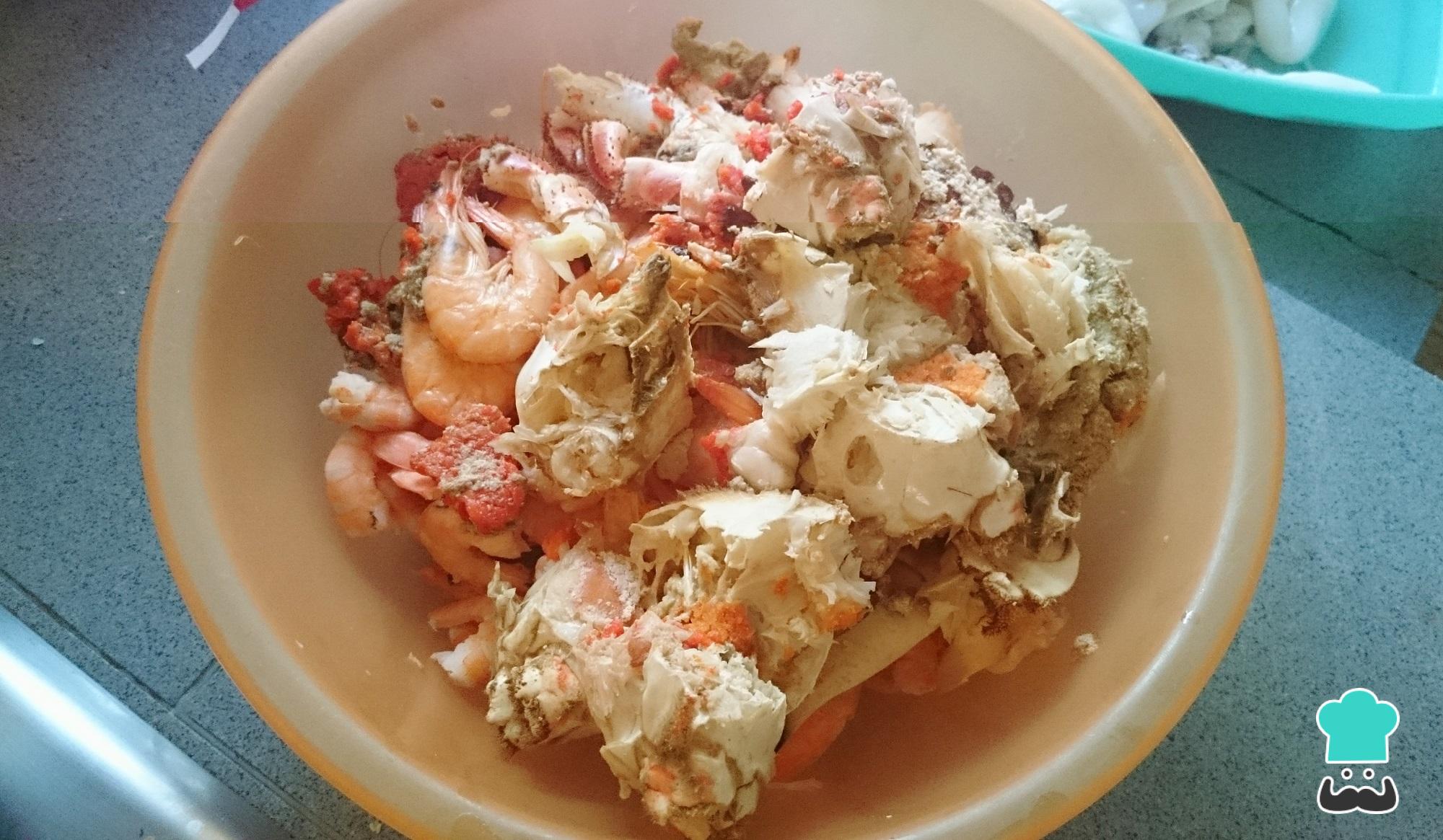 O primeiro passo desta receita de arroz de frutos do mar é, numa panela com água, sal e pimenta caiena a gosto, em fogo médio, cozinhar o camarão e as sapateiras cortadas em pedaços durante cerca de 30 minutos.