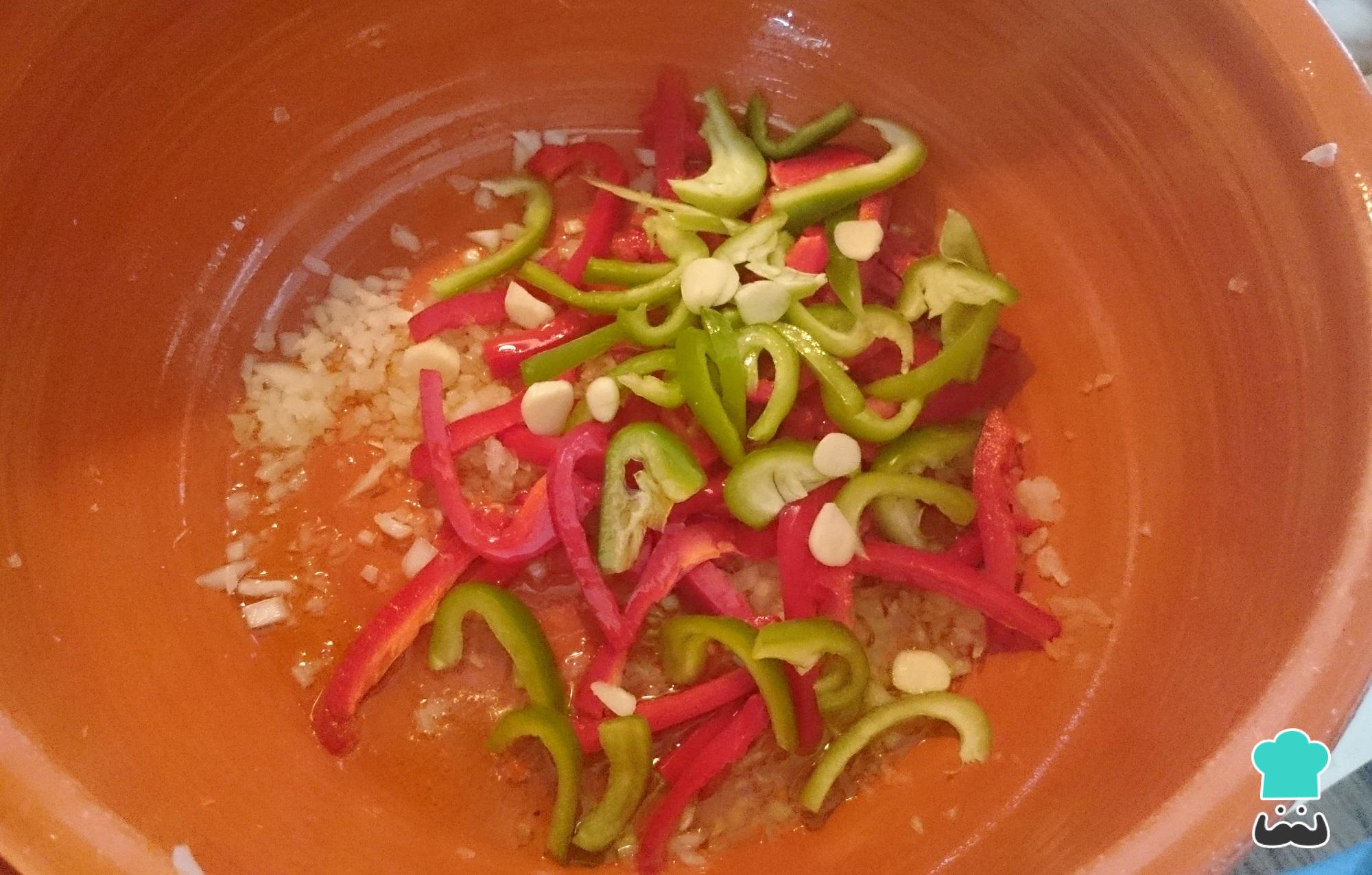 Prepare o refogado do arroz de marisco: numa panela grande (de preferência panela de barro, que conserva melhor o calor) em fogo médio, aqueça o azeite de oliva e acrescente a cebola e os alhos picados, e os pimentões cortados em tiras, como na fotografia.