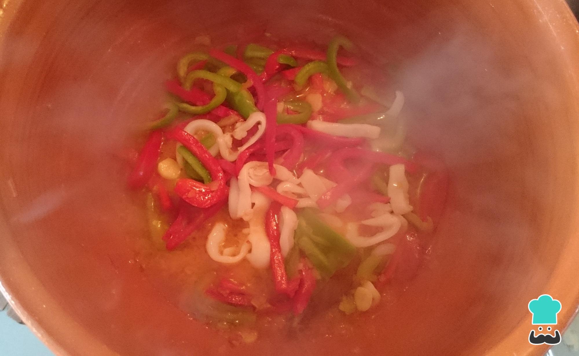 Corte as lulas em anéis e, quando os ingredientes do refogado estiverem murchos, acrescente-as e envolva. Cozinhe por 2-3 minutos, mexendo de vez em quando.