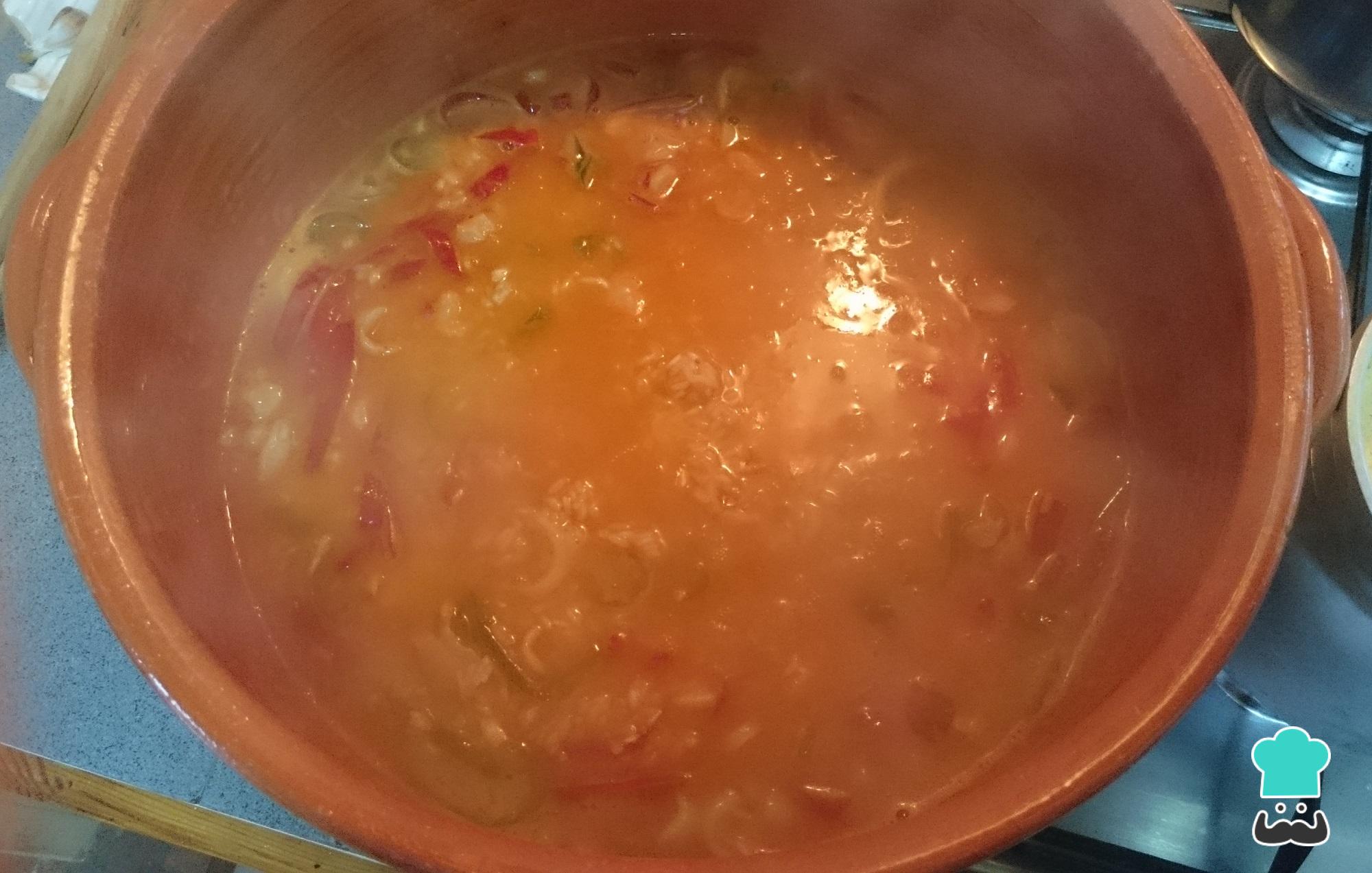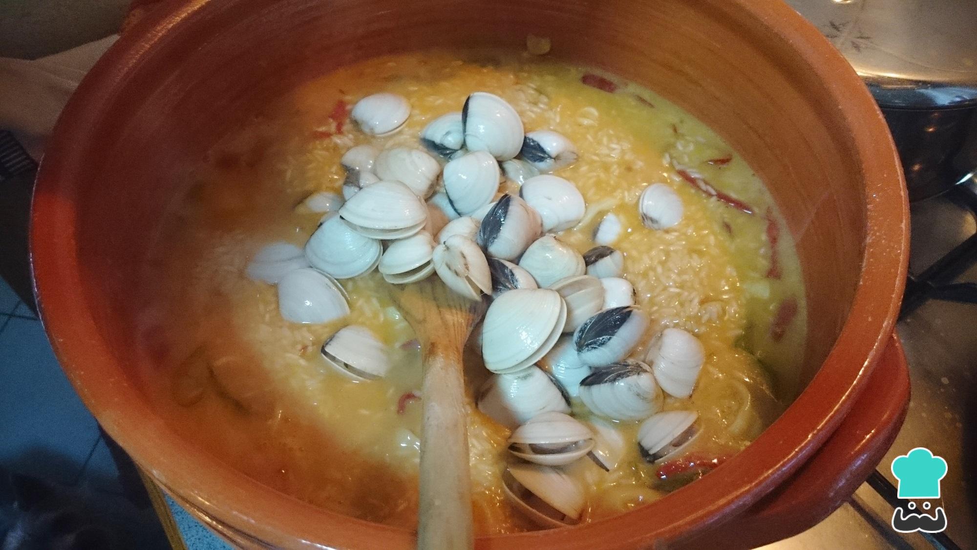 Quando o arroz estiver quase cozinhado, está na hora de acrescentar os vôngoles. Se estiver usando uma panela de barro, desligue o fogo e deixe que o arroz e os vôngoles cozinhem com o próprio calor da panela, porém sem deixar que sequem.