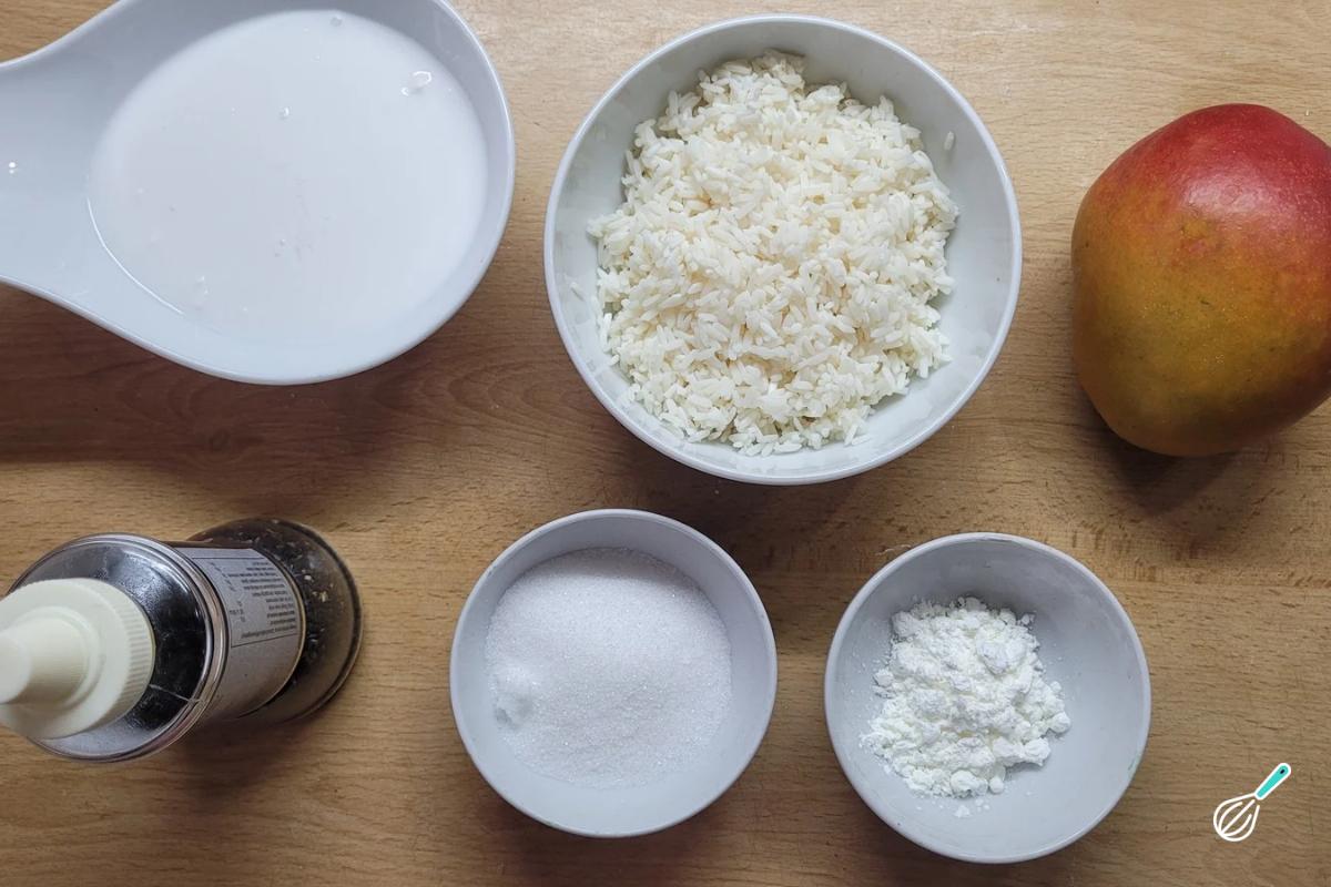 Separe os ingredientes para fazer a receita. Tradicionalmente, nessa receita, se usa o arroz glutinoso, que tem bastante amido e confere a consistência característica da sobremesa. Você encontra esse arroz pela internet ou em lojas de produtos asiáticos, mas se não encontrar pode fazer com arroz de sushi, que vai ter um efeito semelhante.