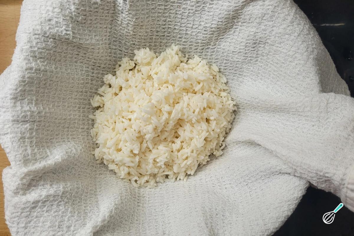 Isso ajuda na consistência e evita que passe do ponto. Para isso, leve uma panela com água para ferver. Quando ferver, apoie uma peneira de forma que a água não encoste nela. Coloque um pano de prato sobre a peneira e o arroz sobre ele.