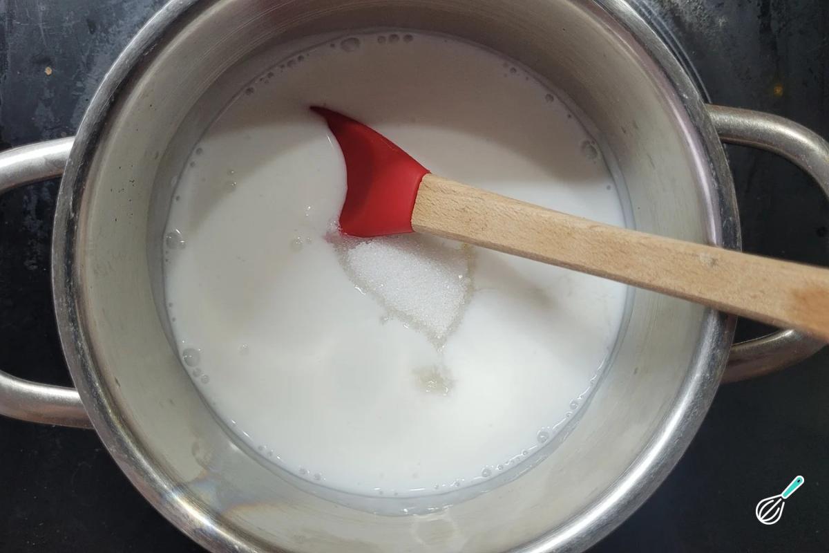 Prepare a calda. Em uma outra panela, coloque o leite de coco e o açúcar. Ligue em fogo baixo até o açúcar dissolver.