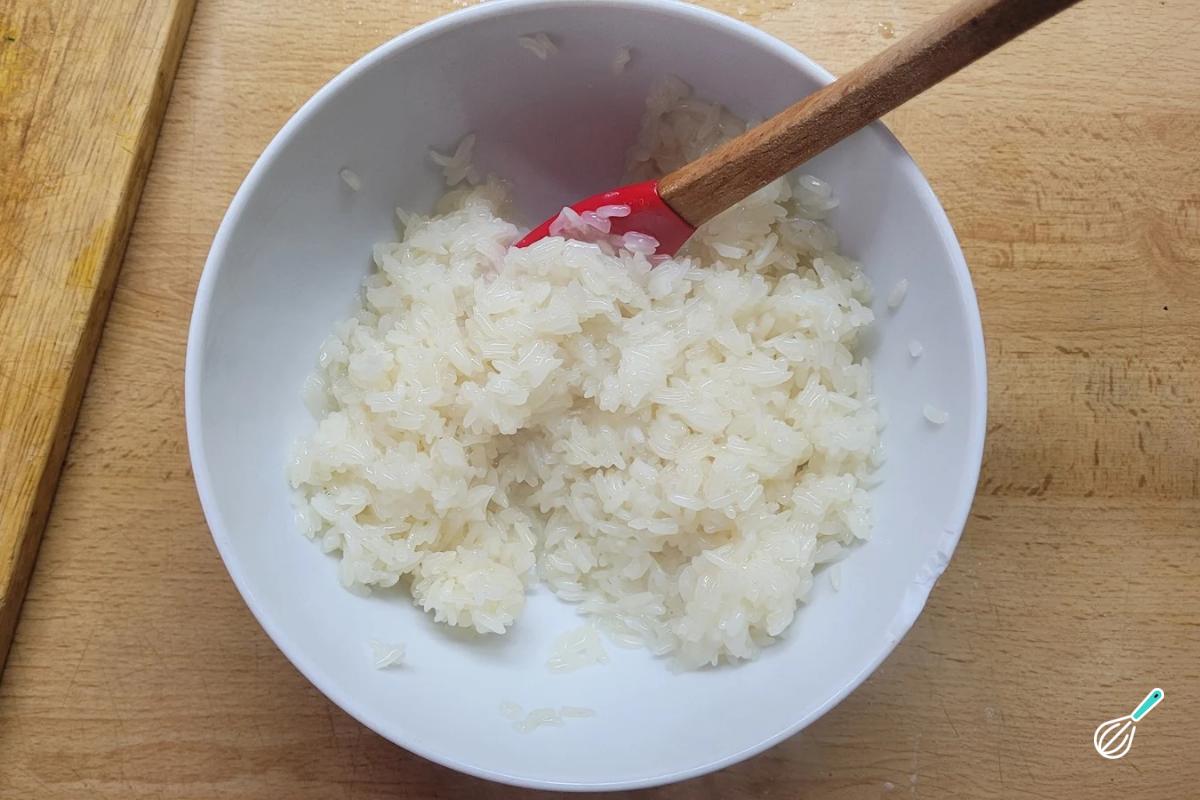 Quando o arroz estiver cozido, transfira para uma tigela e verta metade da calda de coco sobre ele. Reserve a outra metade (pode deixar na panela).