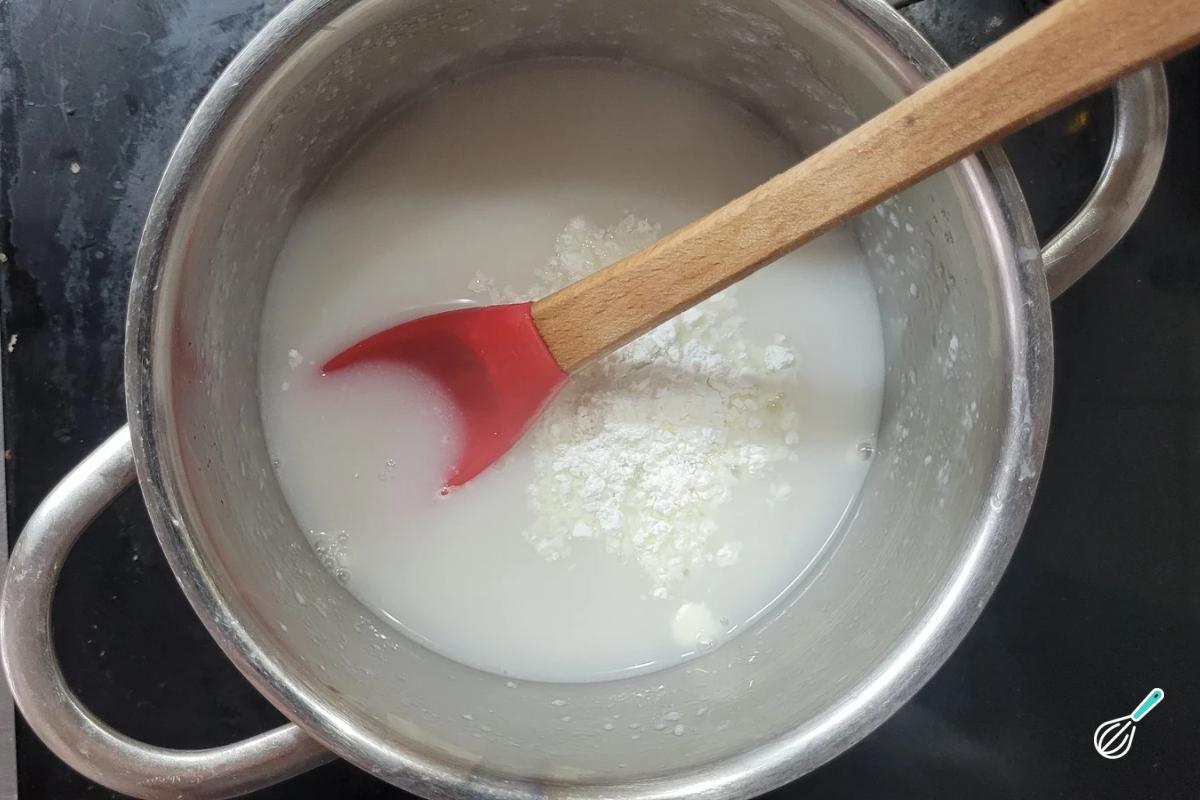 Junte o amido ao restante da calda reservada e volte a ligar o fogo para dissolver o amido e engrossar um pouco, até o ponto desejado.