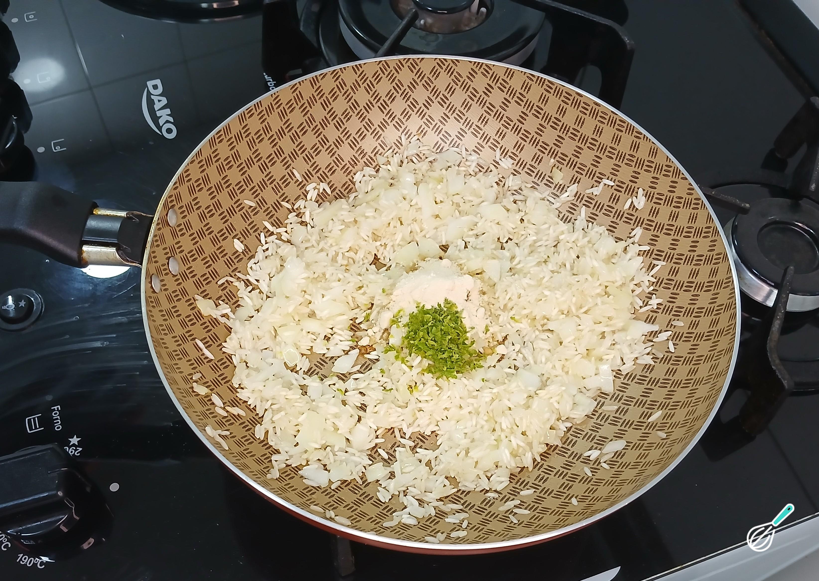Com o arroz já refogado adicione sal, alho em pó, cebola em pó e raspas de limão. Misture bem para que os sabores fiquem bem incorporados.