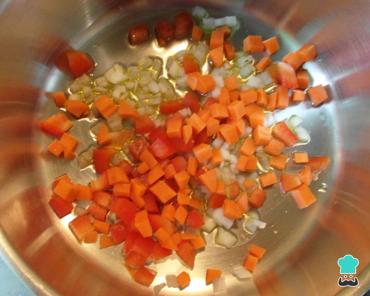 Leve ao fogo uma panela grande com o óleo e refogue a cebola, a cenoura e o pimentão por 1-2 minutos. Bata os ovos numa tigela, junte na panela e fique mexendo até fritá-los.