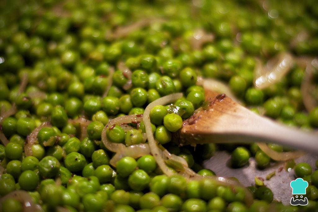Enquanto isso leve ao fogo uma outra panela ou frigideira com metade da manteiga e refogue as ervilhas, a uva-passa e a cebola cortada em lâminas por 2-3 minutos. Junte o ovo batido, tempere com sal e fique mexendo até o ovo estar cozinhado.