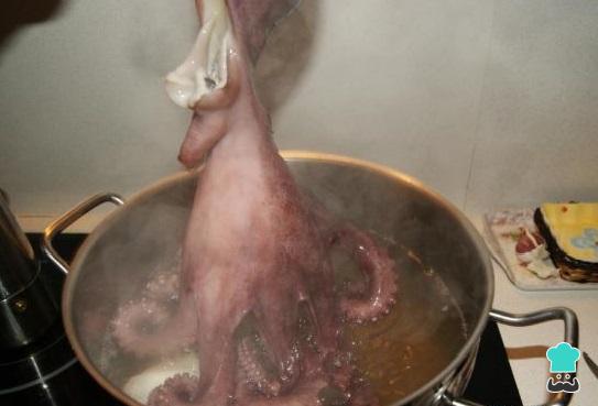 Para começar a sua receita de arroz de polvo, leve o polvo a cozer por 40 minutos em uma panela com água, uma cebola inteira, uma folha de louro e sal a gosto.