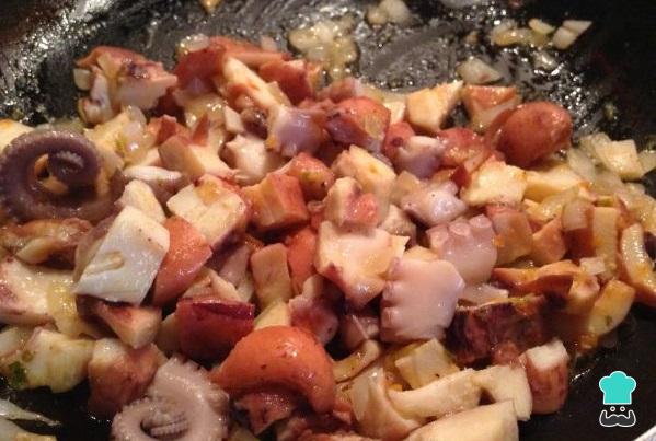 Corte o polvo anteriormente cozido, junte ao refogado, o polvo cortado, os tomates cortados e tempere com um pouco de sal e pimenta do reino.