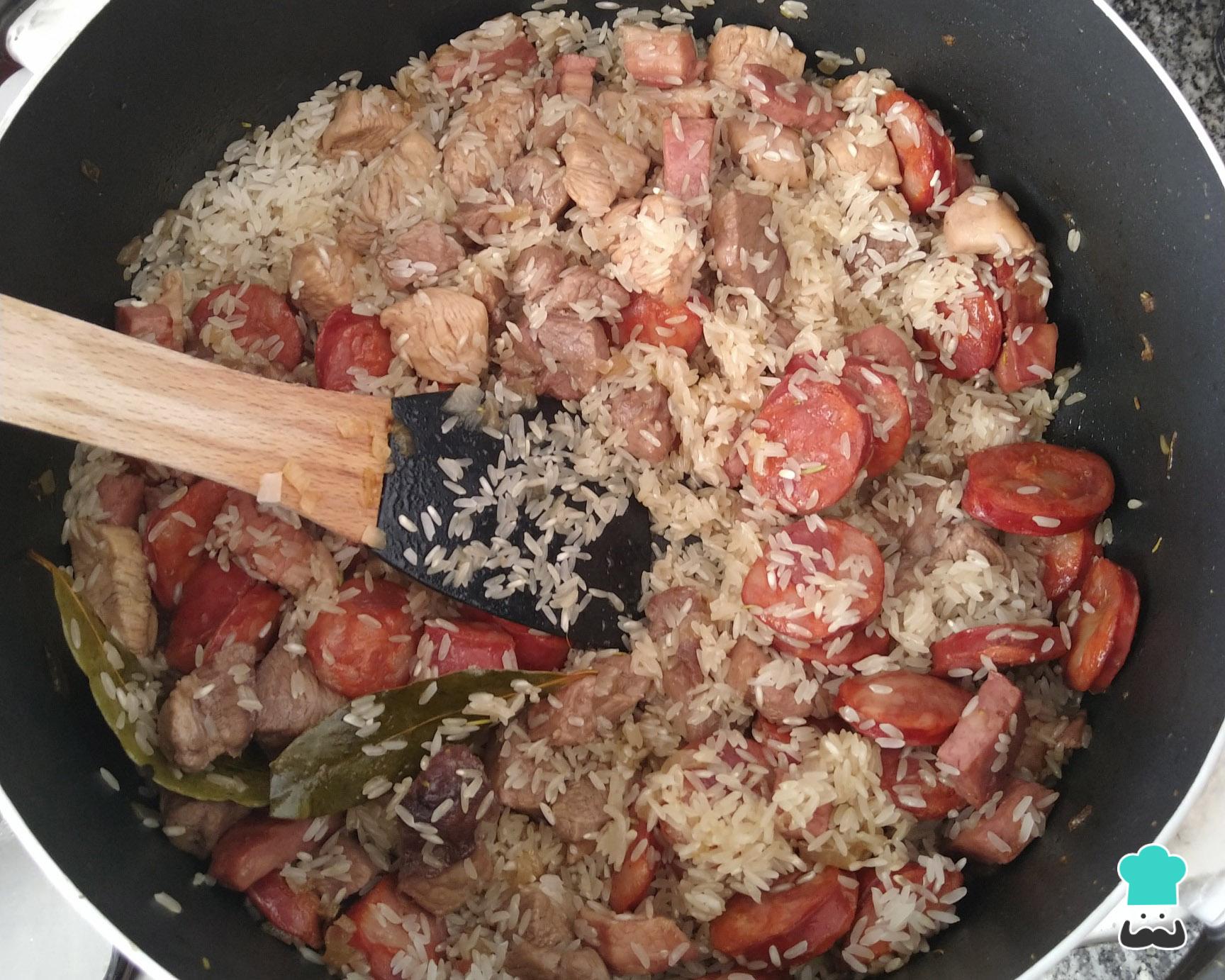Após o bacon e linguiça fritos, entre com o frango e o porco. Vá fritando tudo no fogo médio-baixo até dourar e, por último, acrescente o arroz.