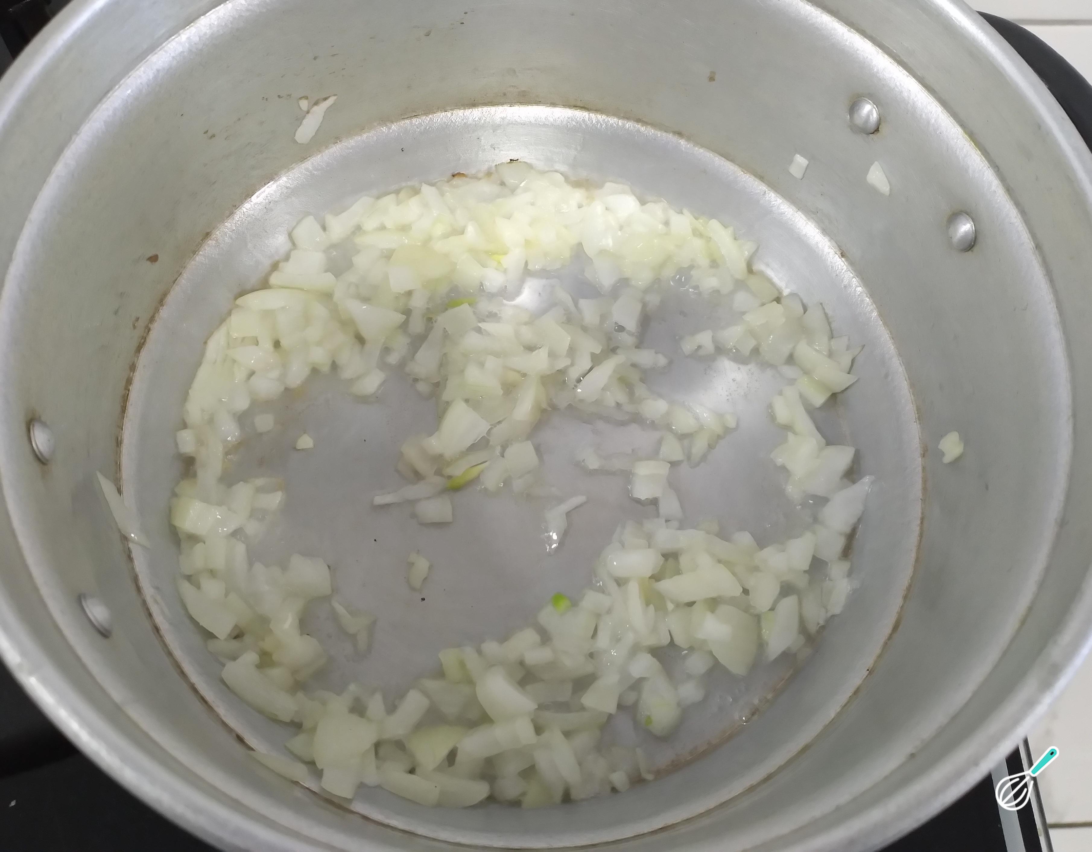 Em uma panela, coloque um pouco de azeite e refogue a cebola.
