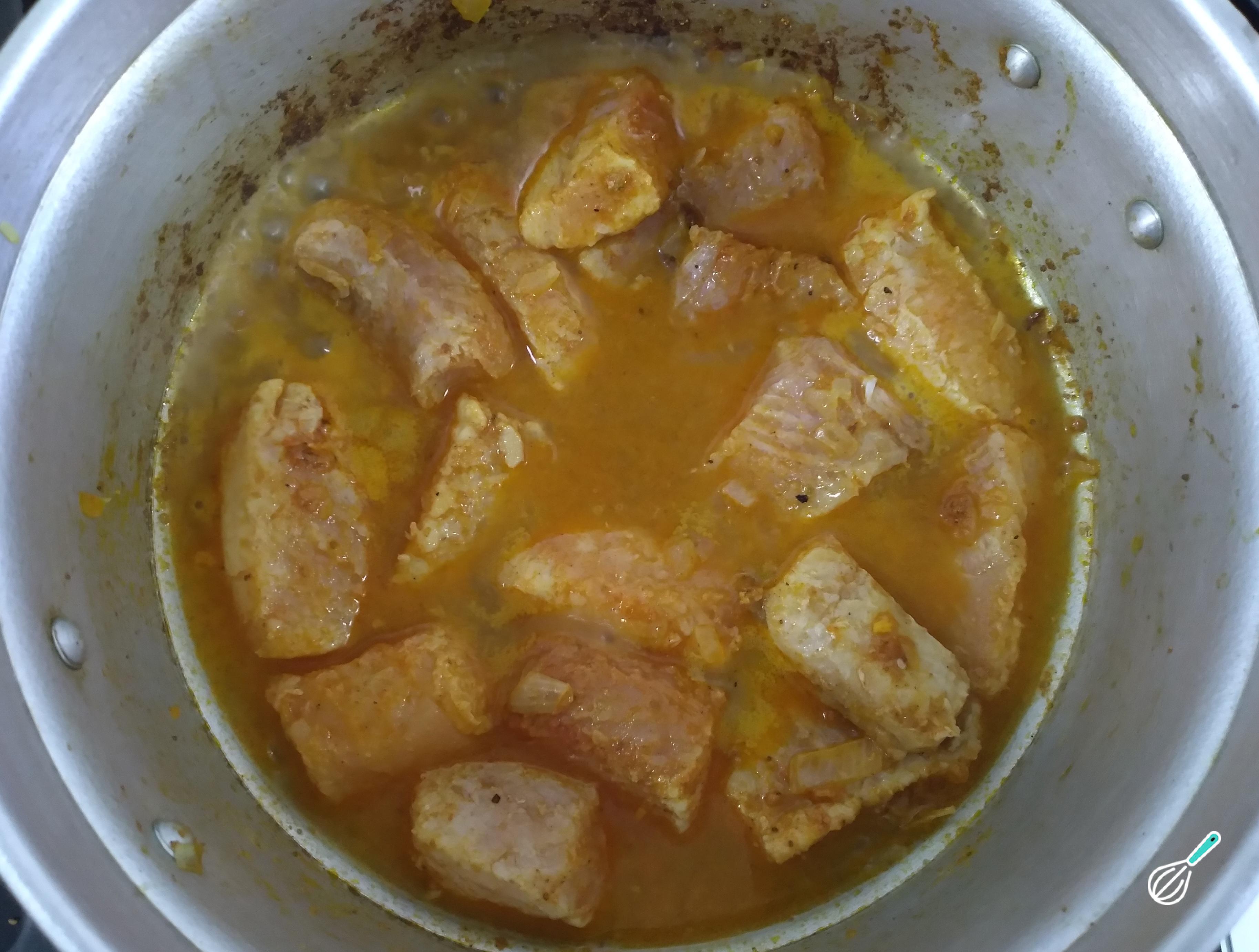 Mexa bem e cubra com água para cozinhar o peixe e formar um caldo.