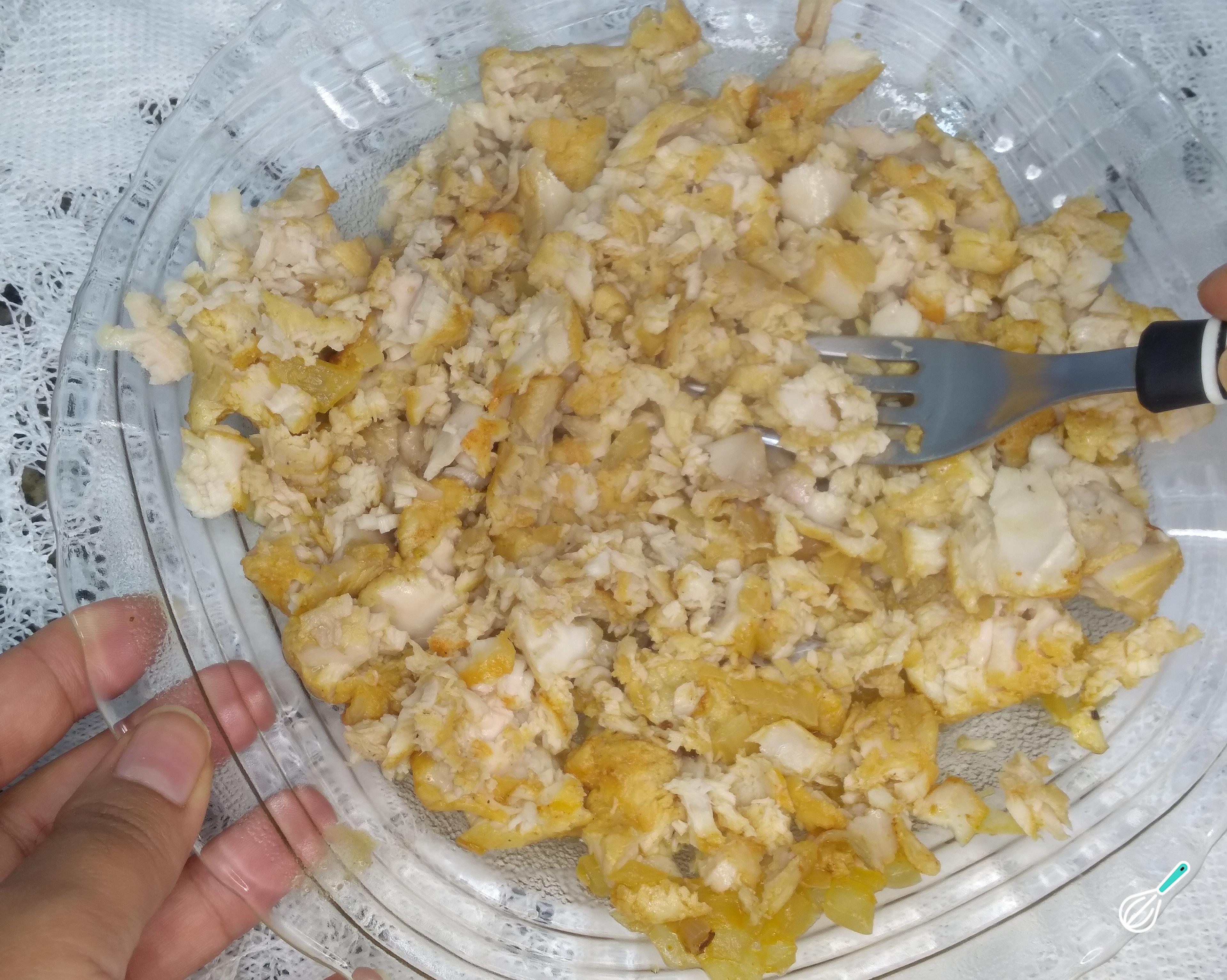 Dica: O ideal é que o peixe fique bem amassado. Mas se preferir e gostar deixe pedaços maiores.