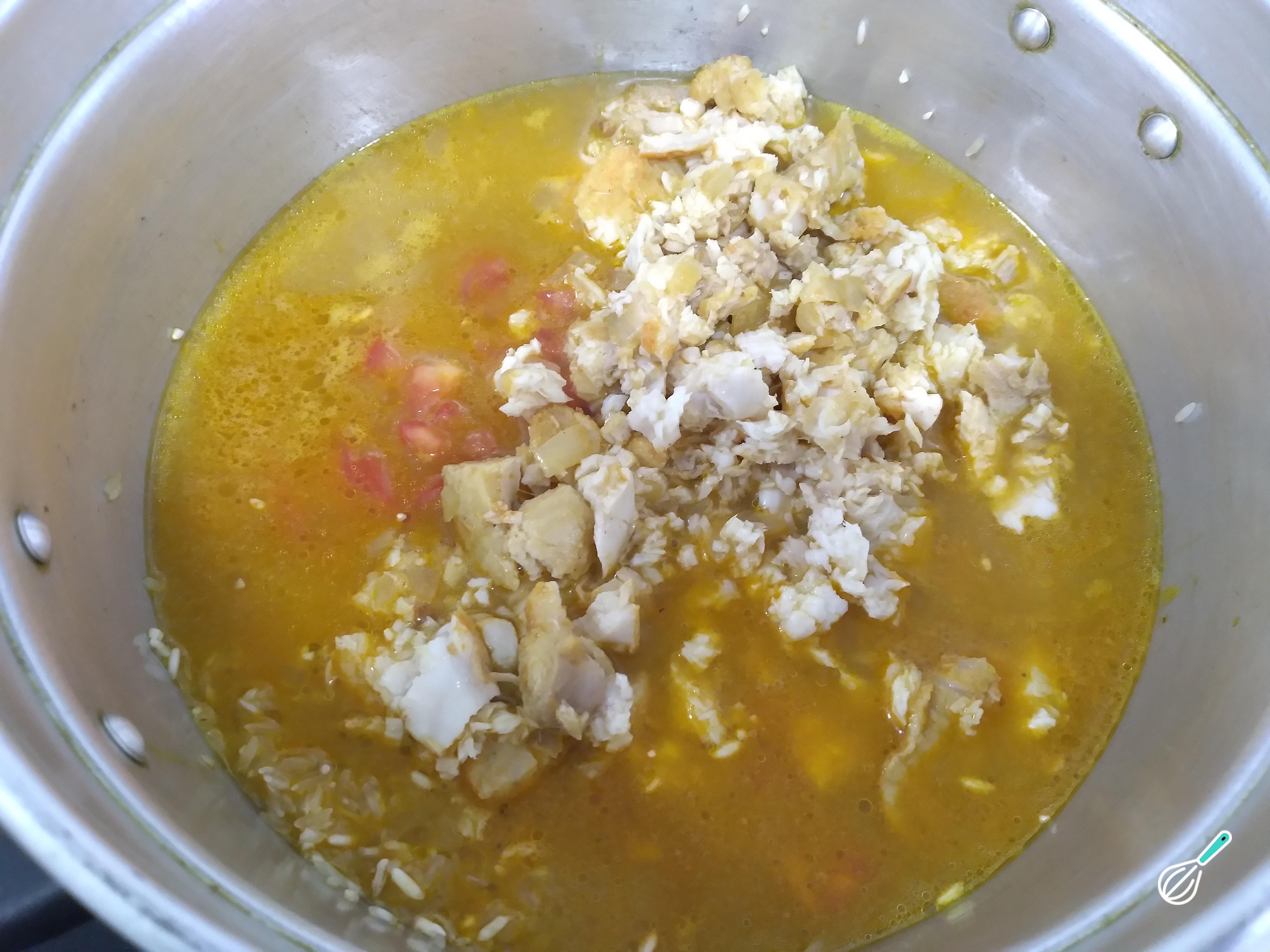Dica: Deixe uma quantidade de caldo para o cozimento do arroz. É importante o peixe estar cortado em cubos, para cozinhar com facilidade.