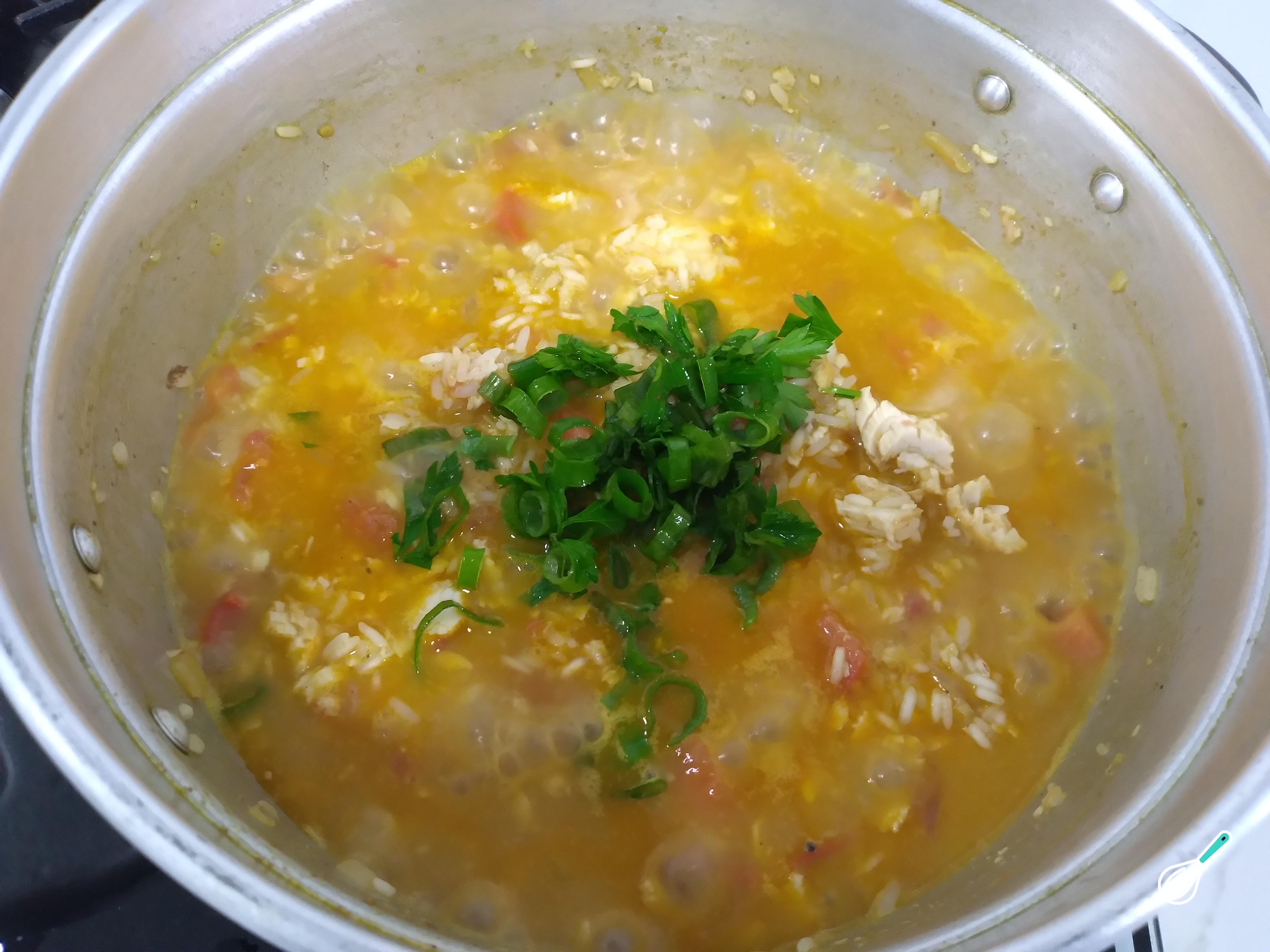 Na segunda água do cozimento do arroz, acrescente a cebolinha verde e salsinha picadas.