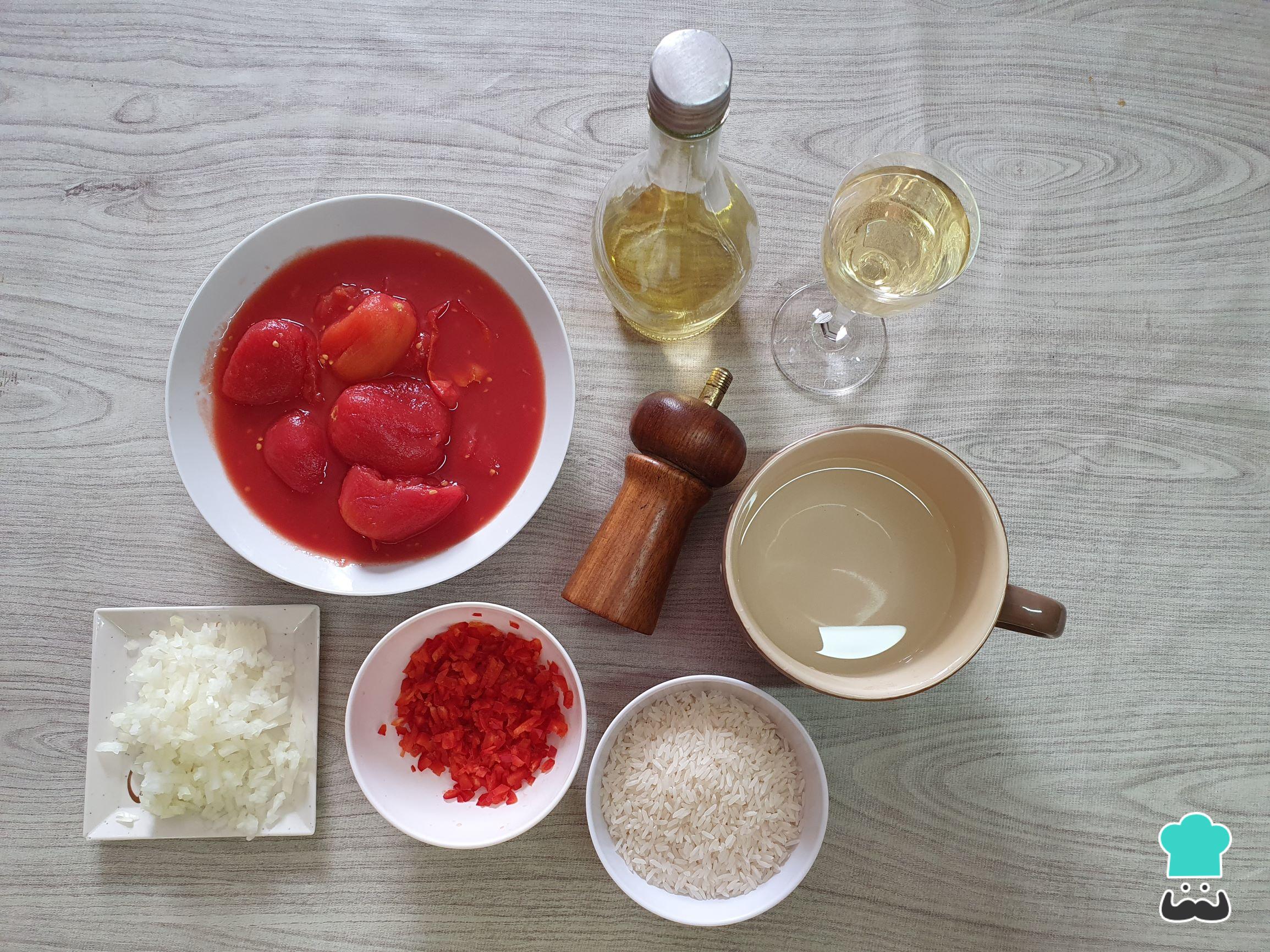 Comece separando todos os ingredientes. Caso queira, você poderá aumentar a receita deste arroz de tomate, basta dobrar as quantidades e terá uma receita para 4 a 5 pessoas. Você irá precisar separar também uma panela e uma espátula ou colher grande.