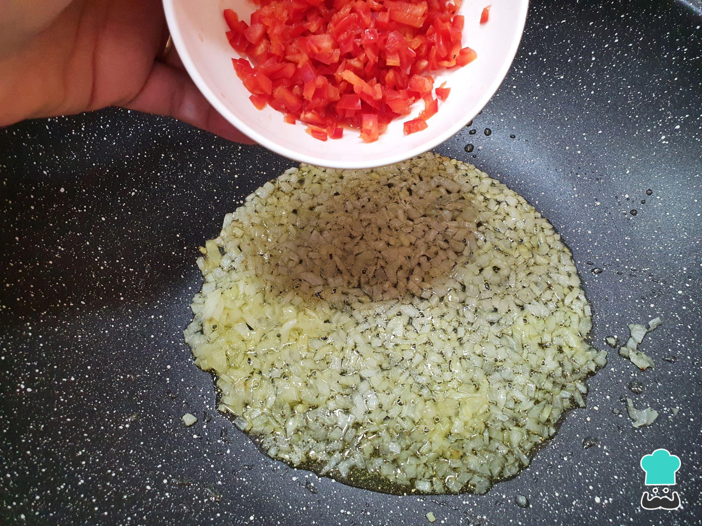 Aqueça uma panela com o azeite e refogue a cebola até que ela comece a murchar e ficar transparente, neste momento acrescente o pimentão picado finamente.