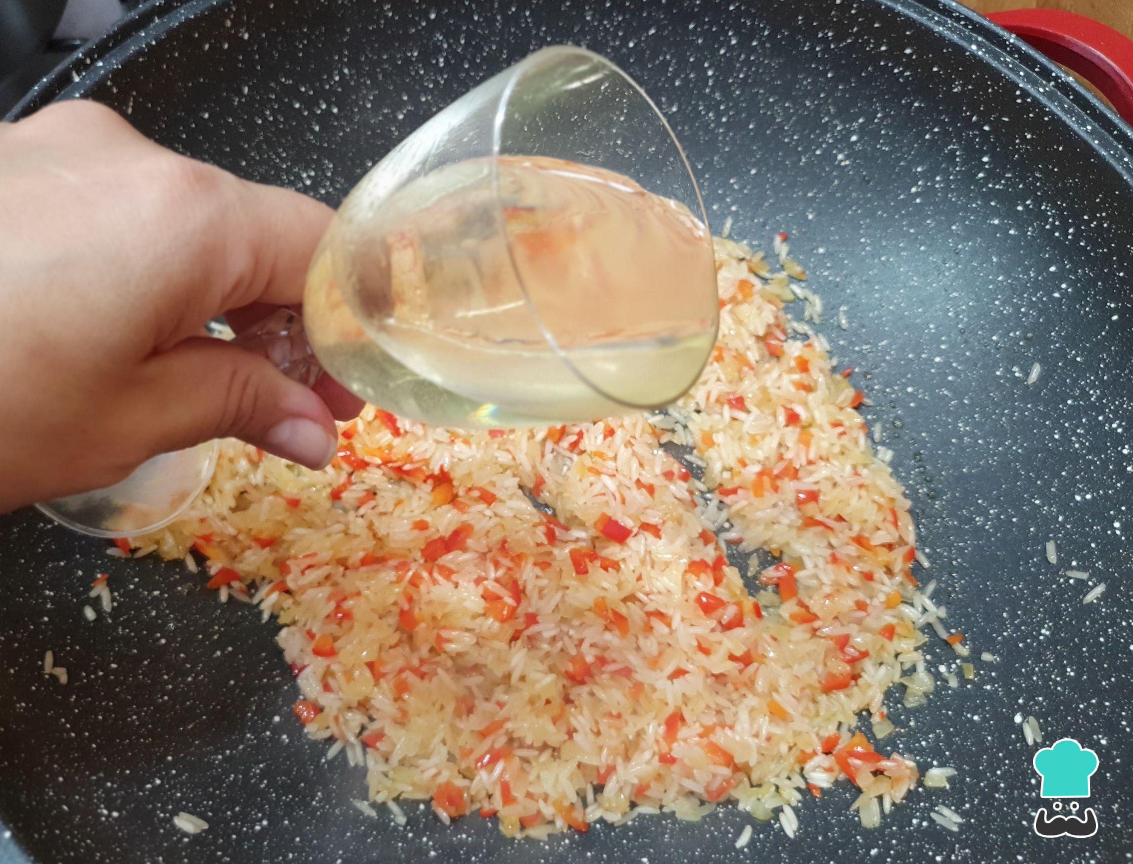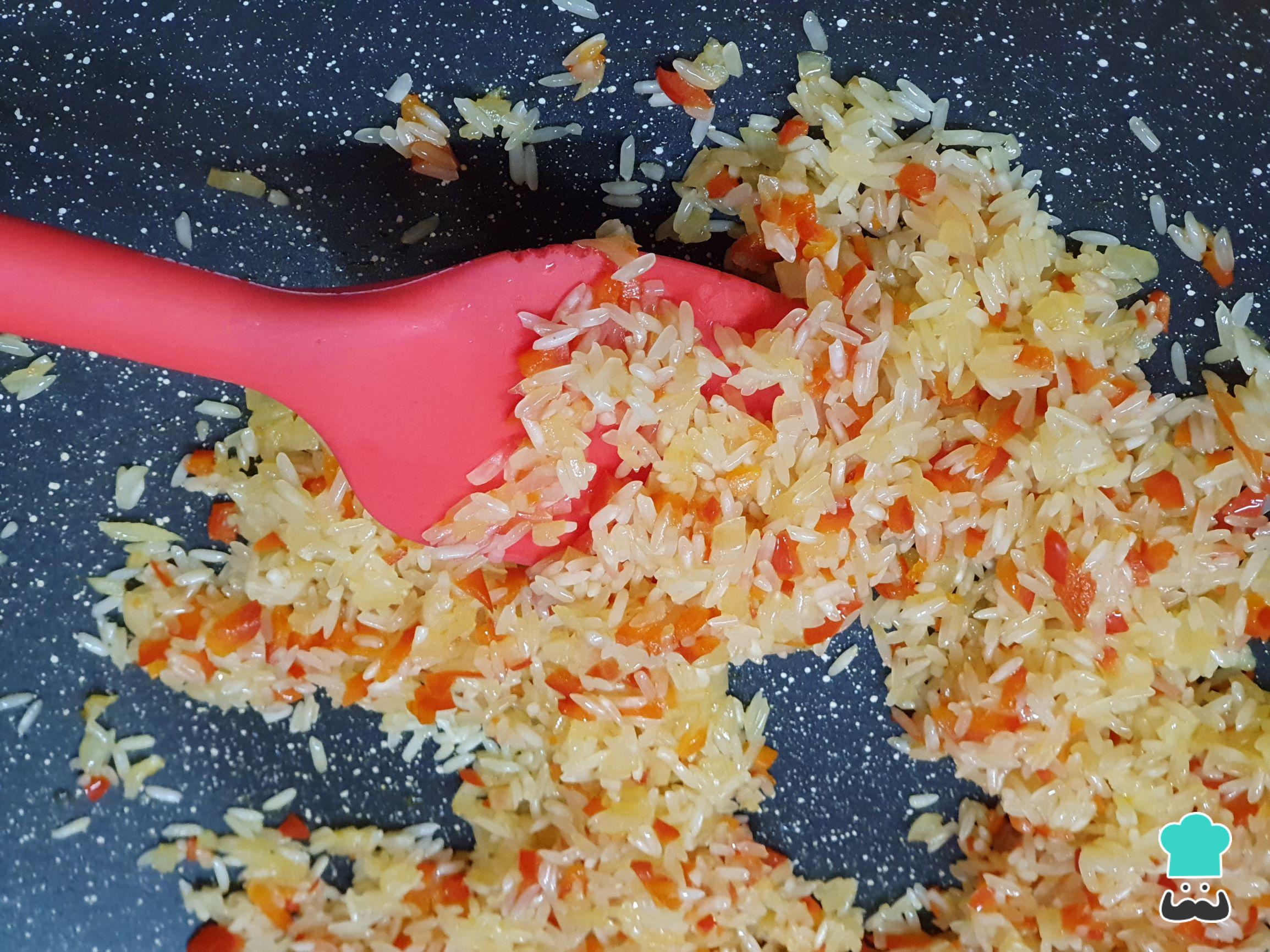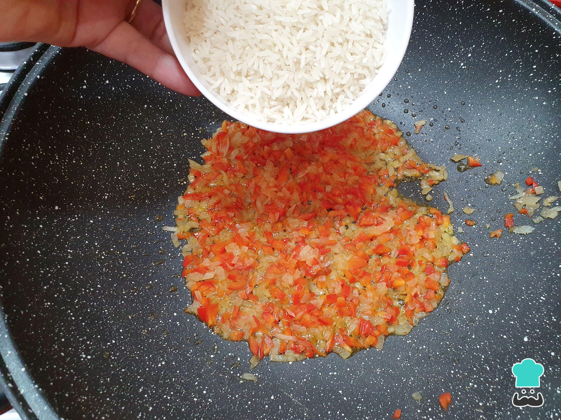 Depois que o pimentão amaciar e a cebola começar a dourar, junte o arroz.