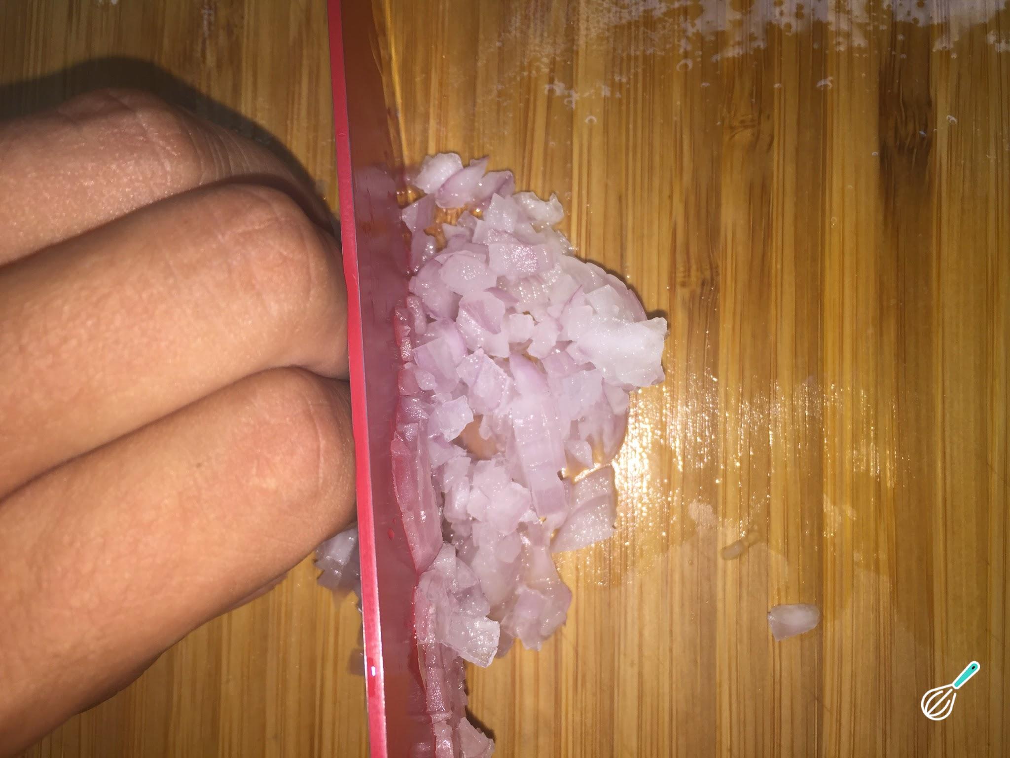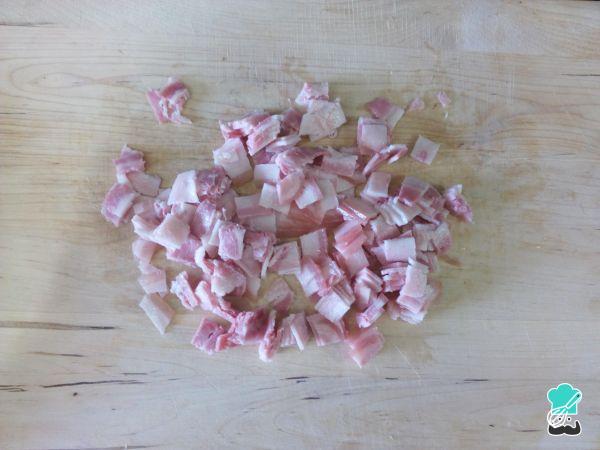 Enquanto a cebola refoga, corte o toucinho em pedaços bem pequenos.