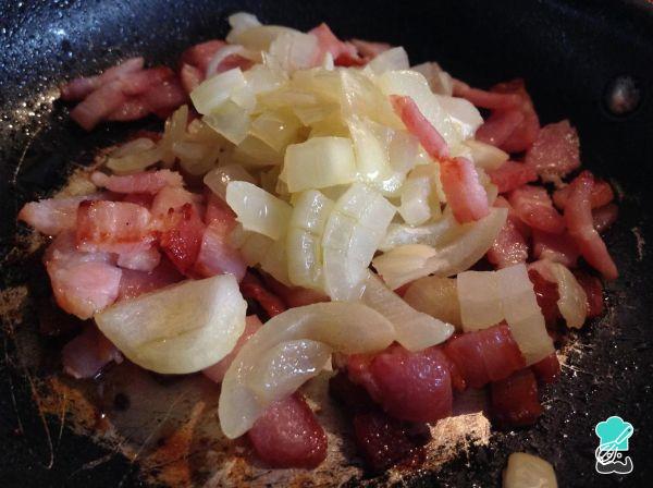 Junte o toucinho ao refogado da cebola e deixe refogar até que o toucinho fique dourado.
