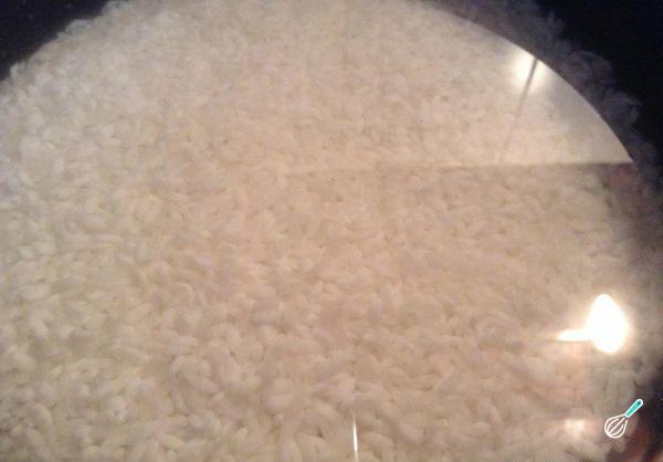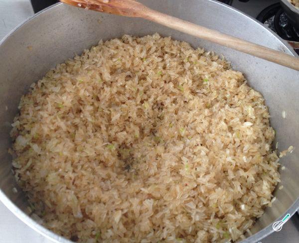 Quando o bacon estiver dourado junte o arroz e deixe fritar um pouco. Enquanto o arroz frita, aqueça a água.
