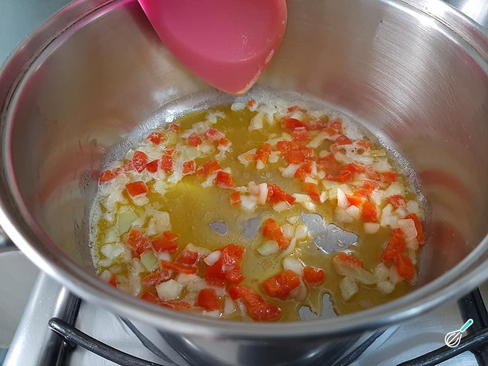 Em uma panela, em fogo médio, derreta a manteiga e refogue a cebola e o pimentão picados até murcharem um pouco.