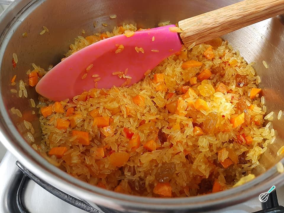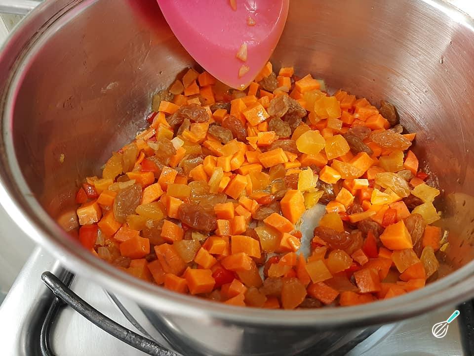Adicione o damasco picado, as uvas passas e a cenoura em cubinhos, refogando por 2 minutos.