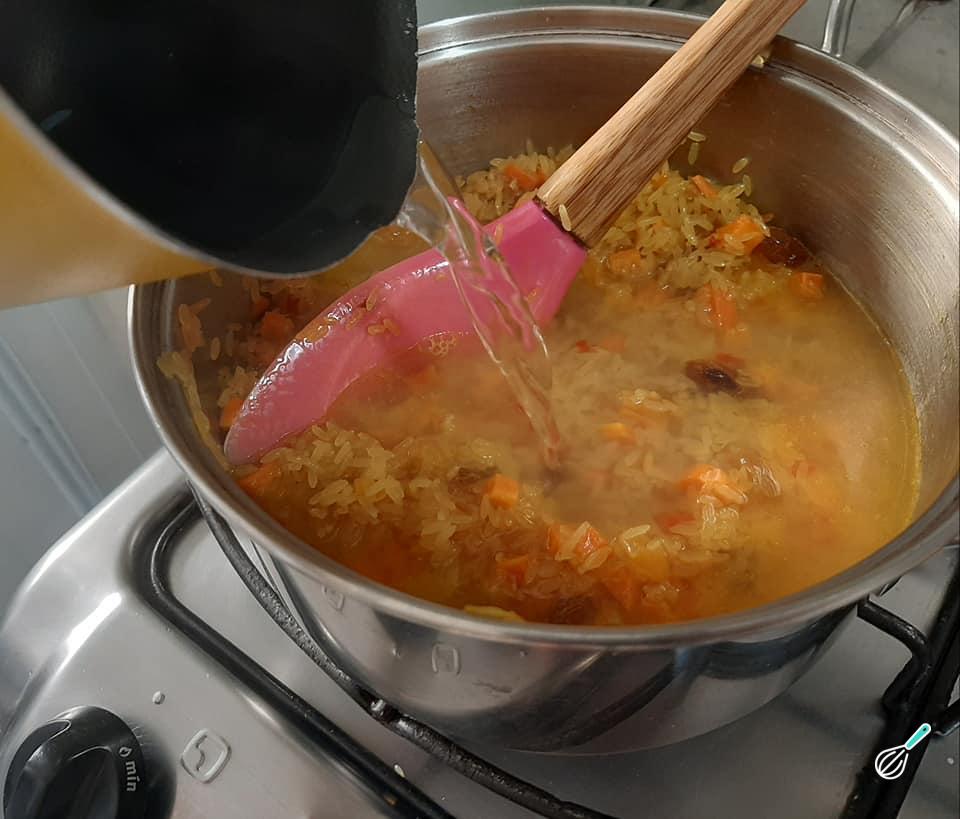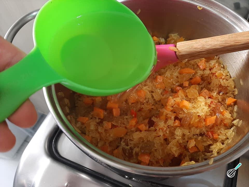 Por fim preencha com a água quente, misturando bem os ingredientes. Acerte o sal e deixe cozinhando em fogo médio até a água secar. Após este tempo, feche a panela e deixe o arroz descansar por alguns minutos.