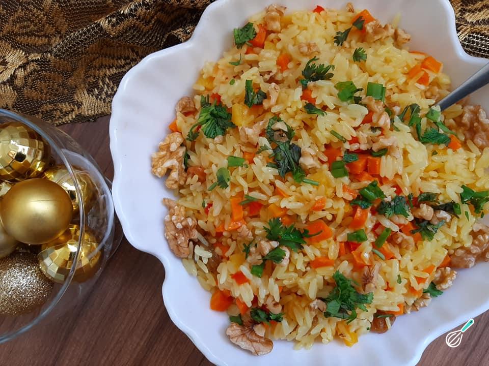 Este prato de arroz bem soltinho possui um sabor rico e bem delicado com a junção das uvas passas, do damasco e das nozes! O toque de açafrão e do vinho seco também irão conquistar o seu paladar!