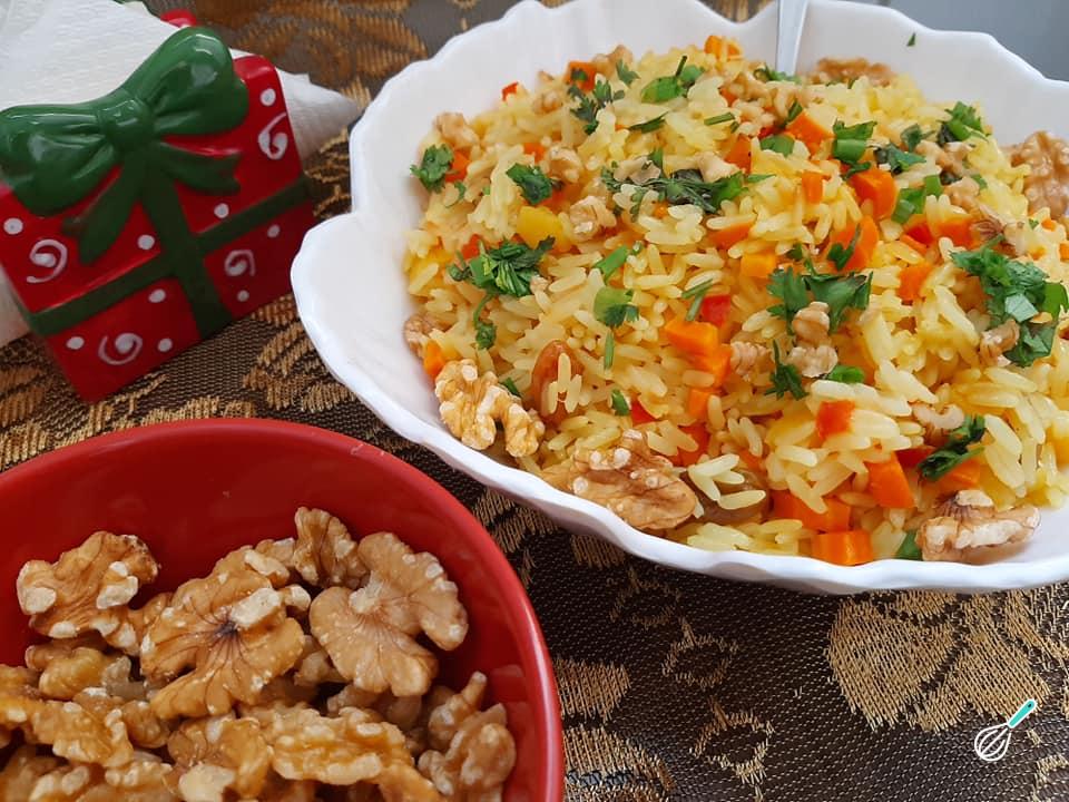 Coloque esse arroz especial num prato, polvilhe cheiro verde picado e decore com nozes picadas!