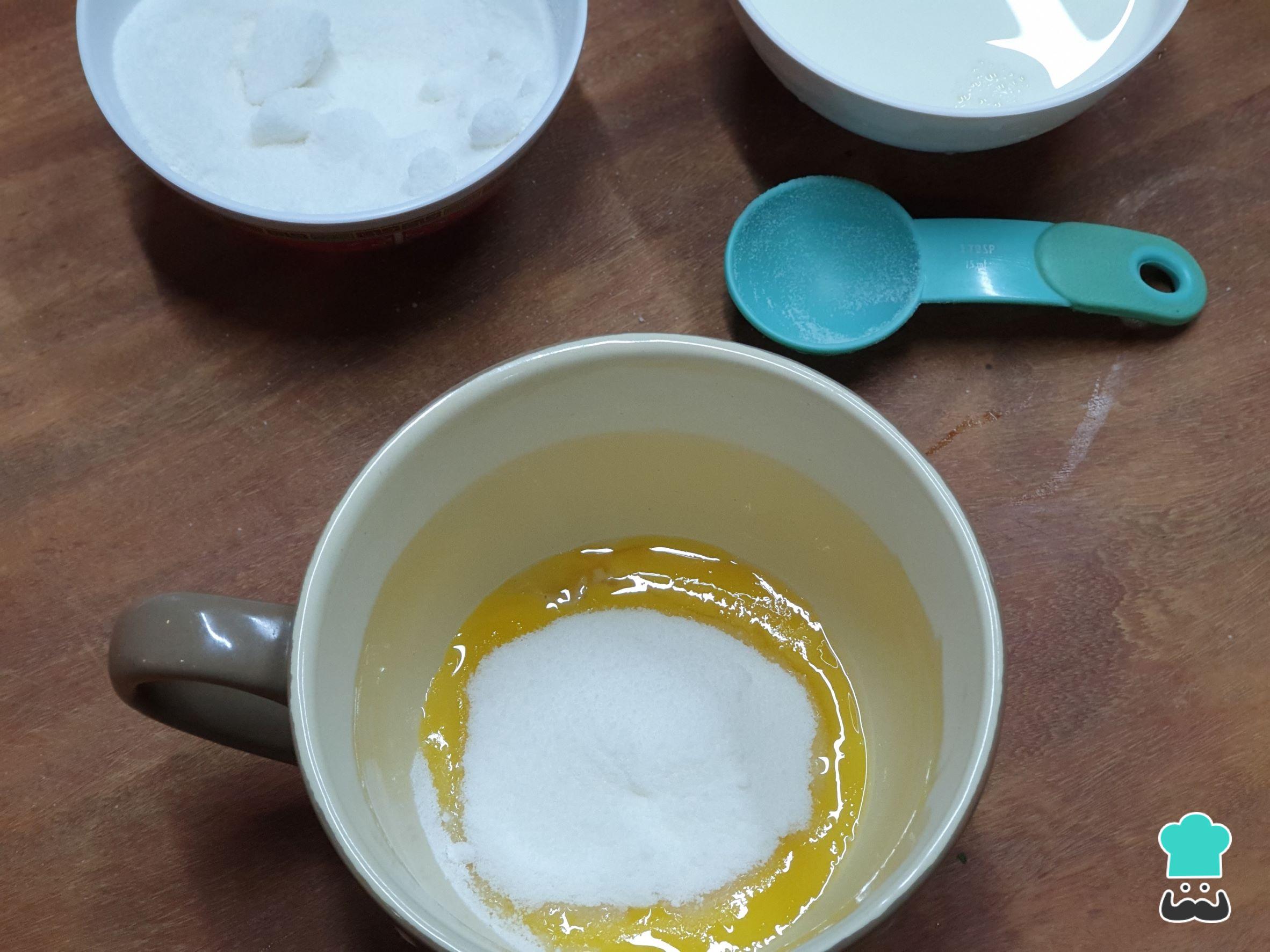 Enquanto isso, faça uma gemada com o açúcar e as gemas. Para isso simplesmente misture os dois ingredientes, fora do fogo e com uma colher.