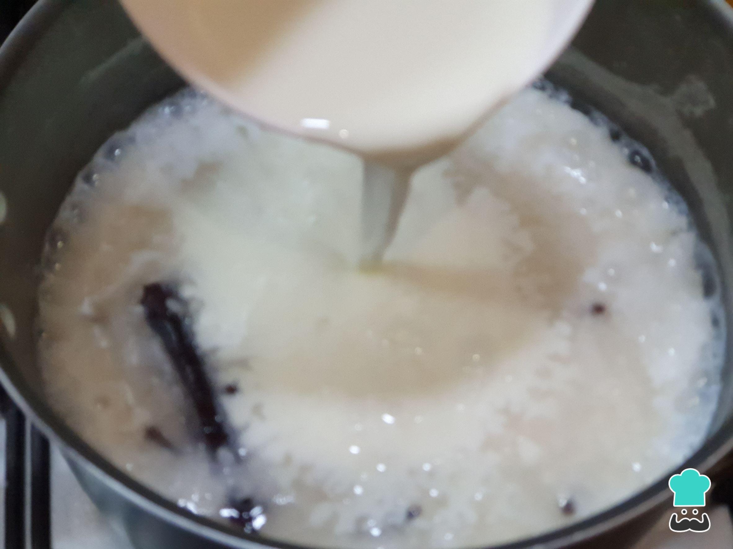 Assim que o arroz estiver quase seco, junte o leite. Abaixe o fogo e cozinhe até que o arroz esteja macio.