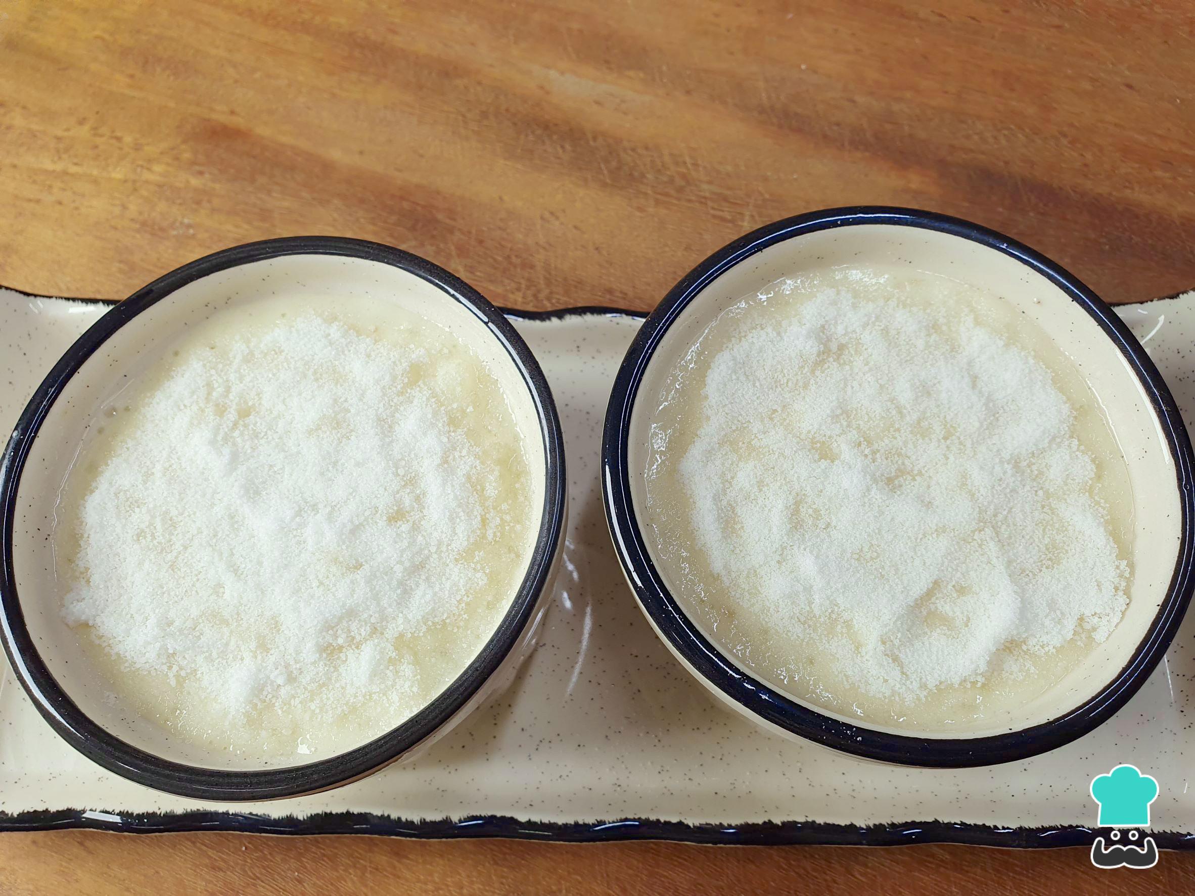Distribua o arroz em ramequins ou tacinhas individuais e polvilhe as colheradas de açúcar sobre a superfície do arroz.