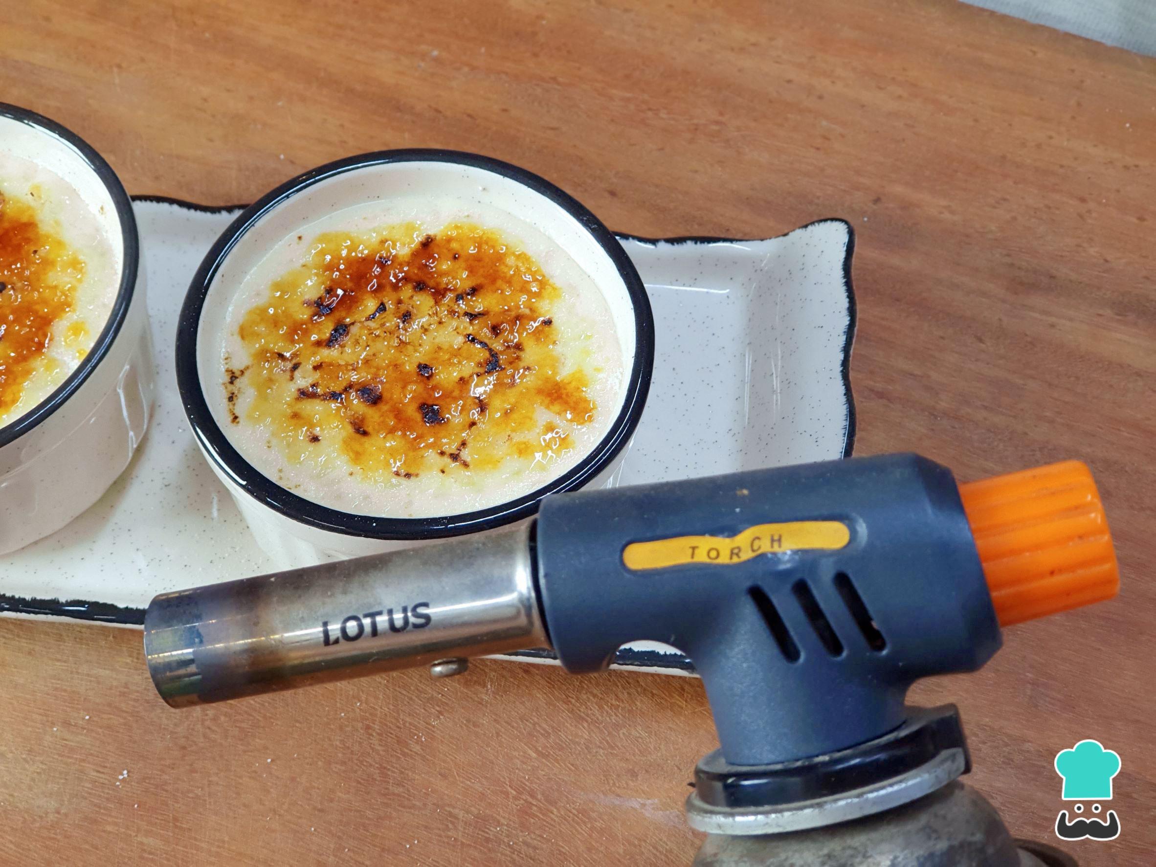 Com a ajuda de um maçarico, é hora de dar o "efeito brûlée" na sobremesa! Com a chama, derreta o açúcar até que ele fique caramelizado. Espere alguns segundos, para que o caramelo fique firme e forme aquela "casquinha".