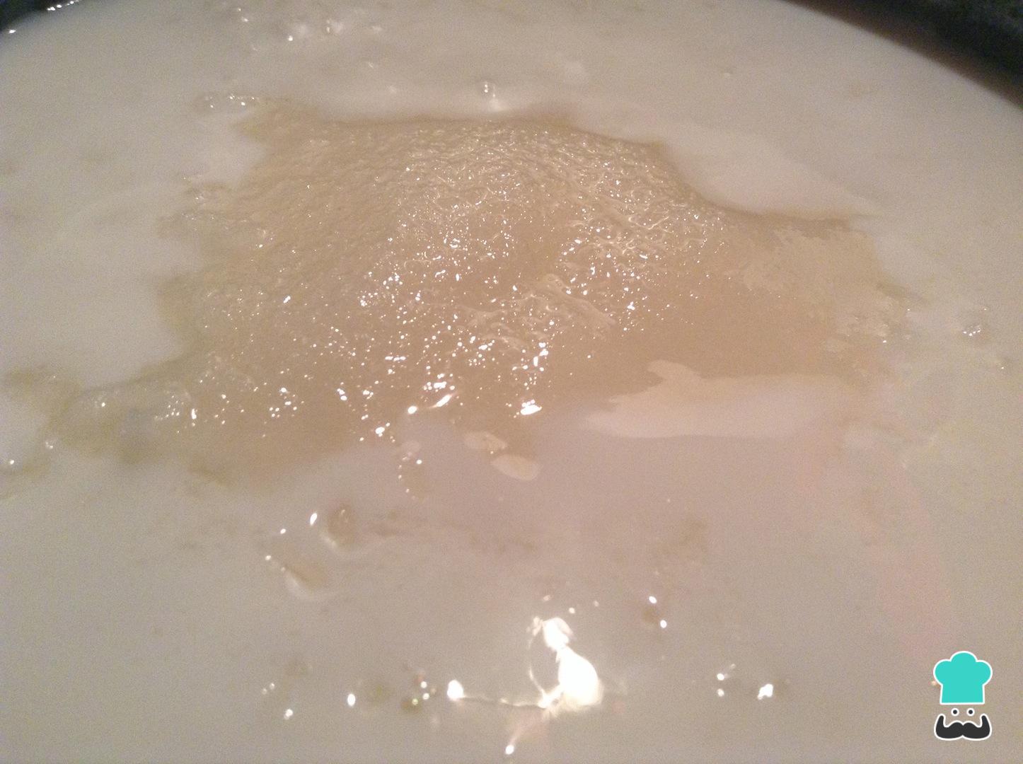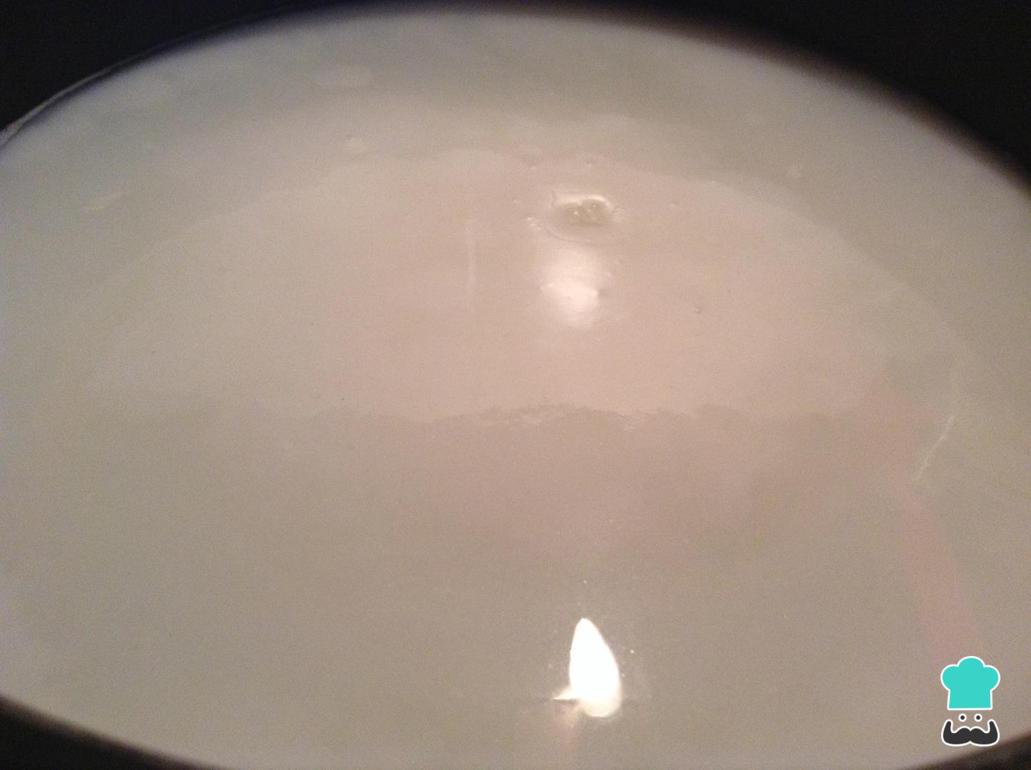 Quando o leite começar fervendo, junte o açúcar e, se quiser, um pouco de essência de baunilha. Baixe o fogo e tampe a panela.