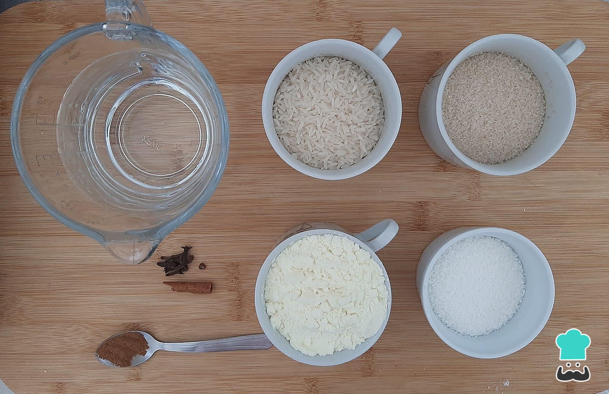 Separe todos os ingredientes necessários para preparar a receita de arroz doce com leite em pó.