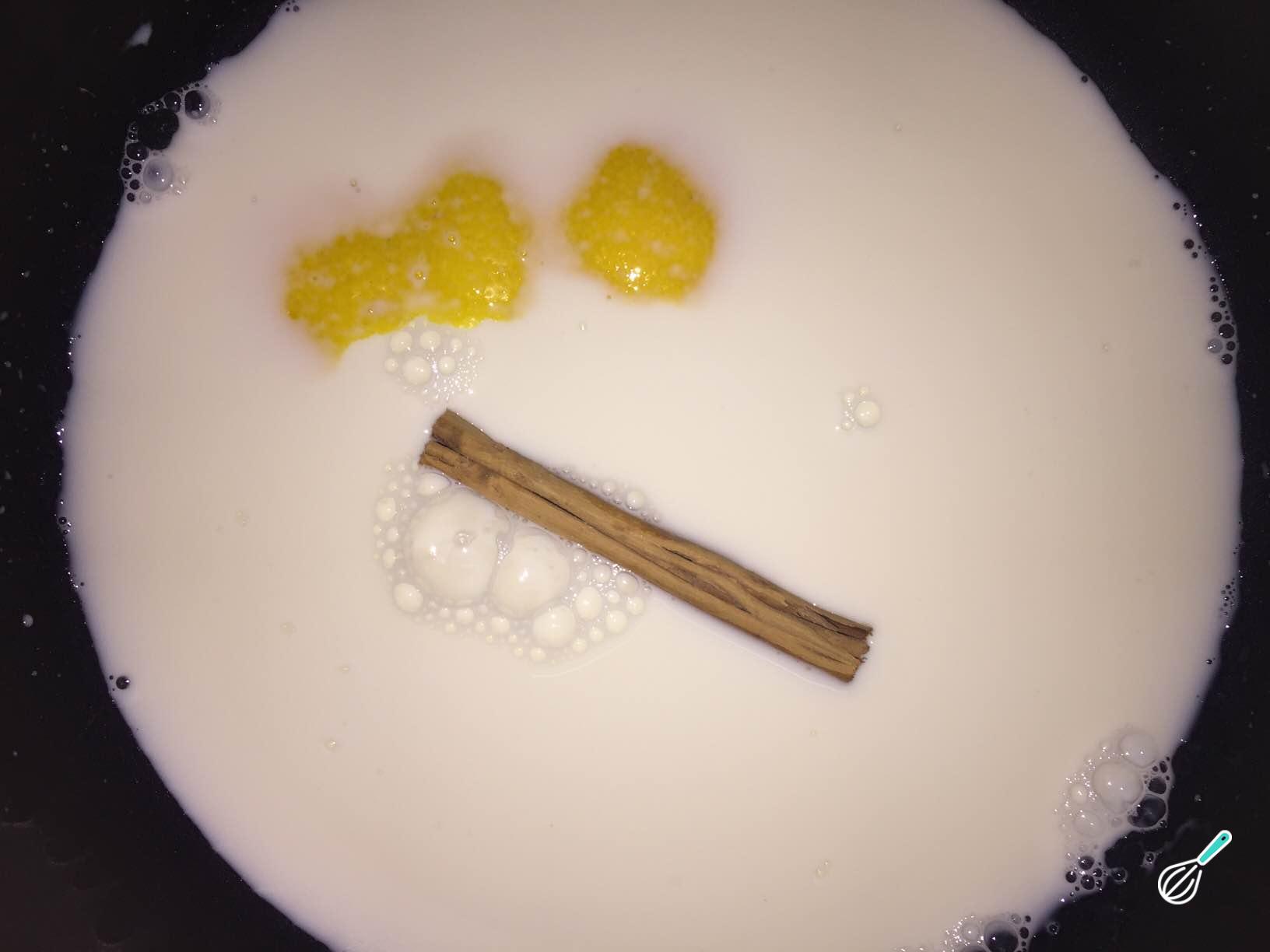 Em uma outra panela coloque o leite para aquecer, juntamente com a casca de limão e o pau de canela. Vá mexendo e não deixe o leite levantar fervura.