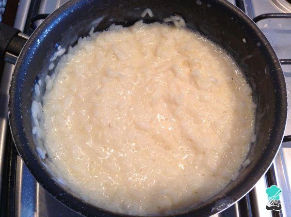Retire o arroz do fogo e acrescente as gemas de ovos em fio, sempre a mexer para evitar que as gemas cozam.