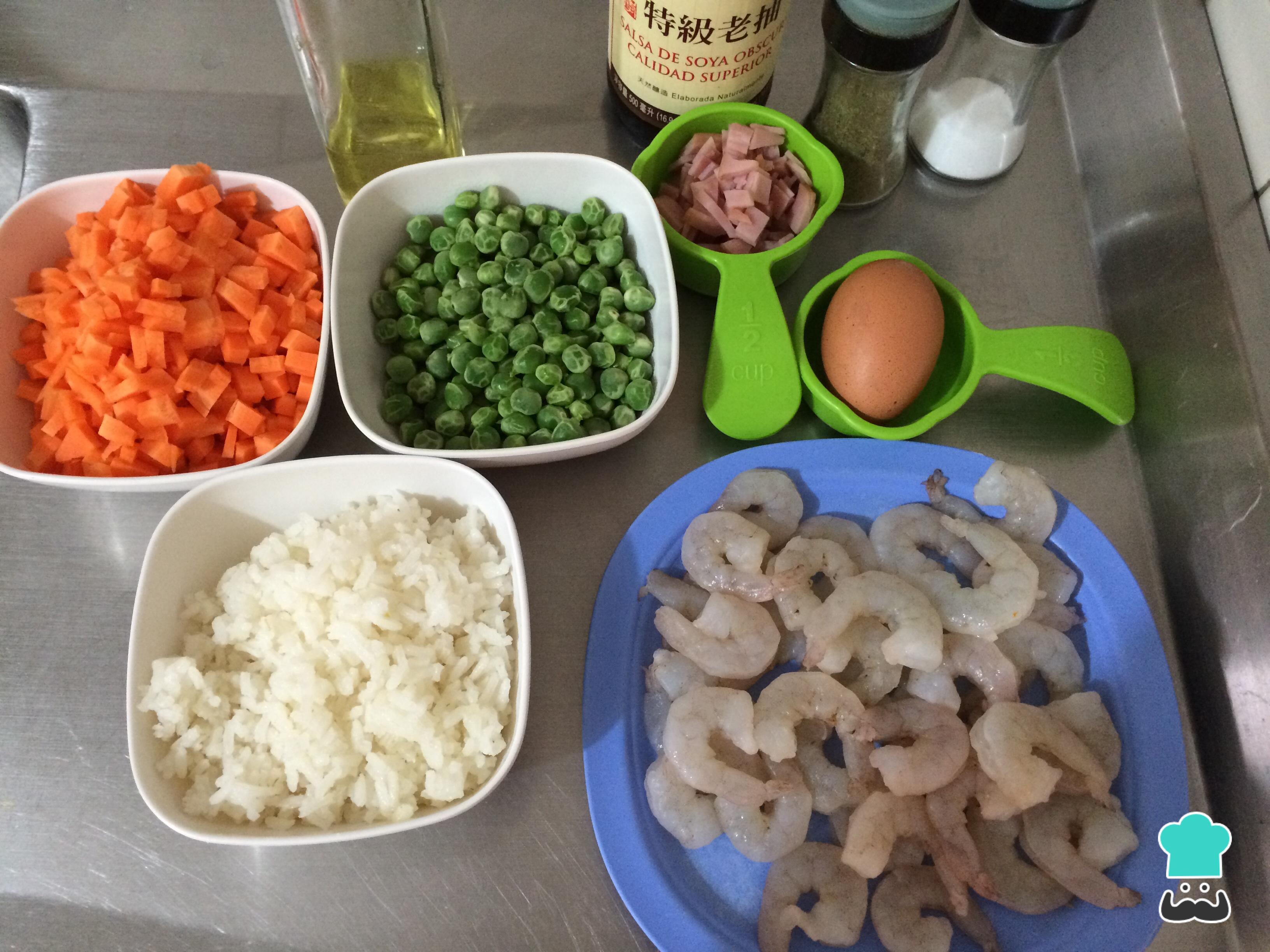 Antes de começar preparando esta receita de arroz frito com camarão e legumes, o primeiro passo é reunir os ingredientes.
