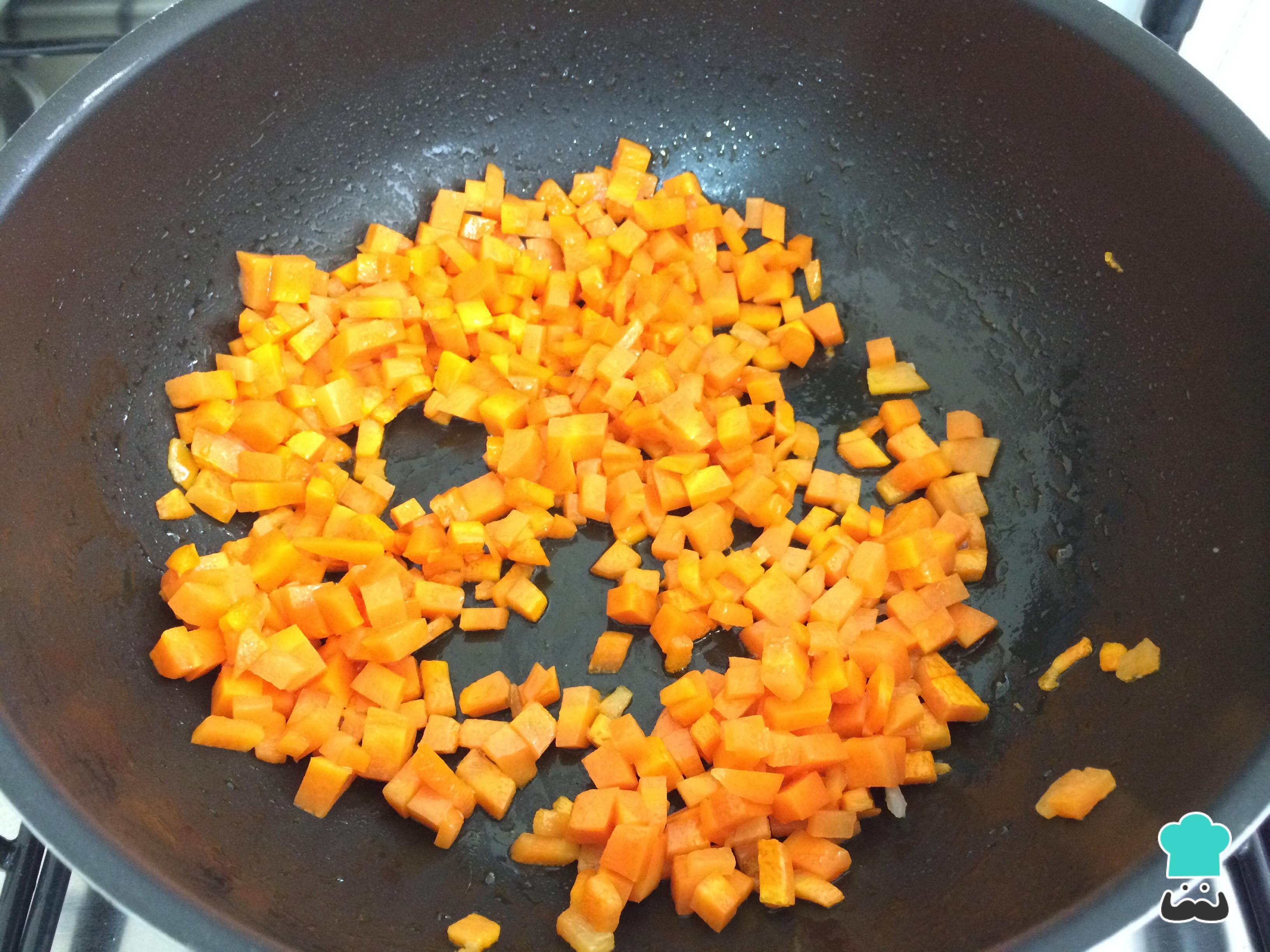 Em uma frigideira com um pouco de óleo, frite a cenoura cortada em cubos pequenos até que esteja macia.