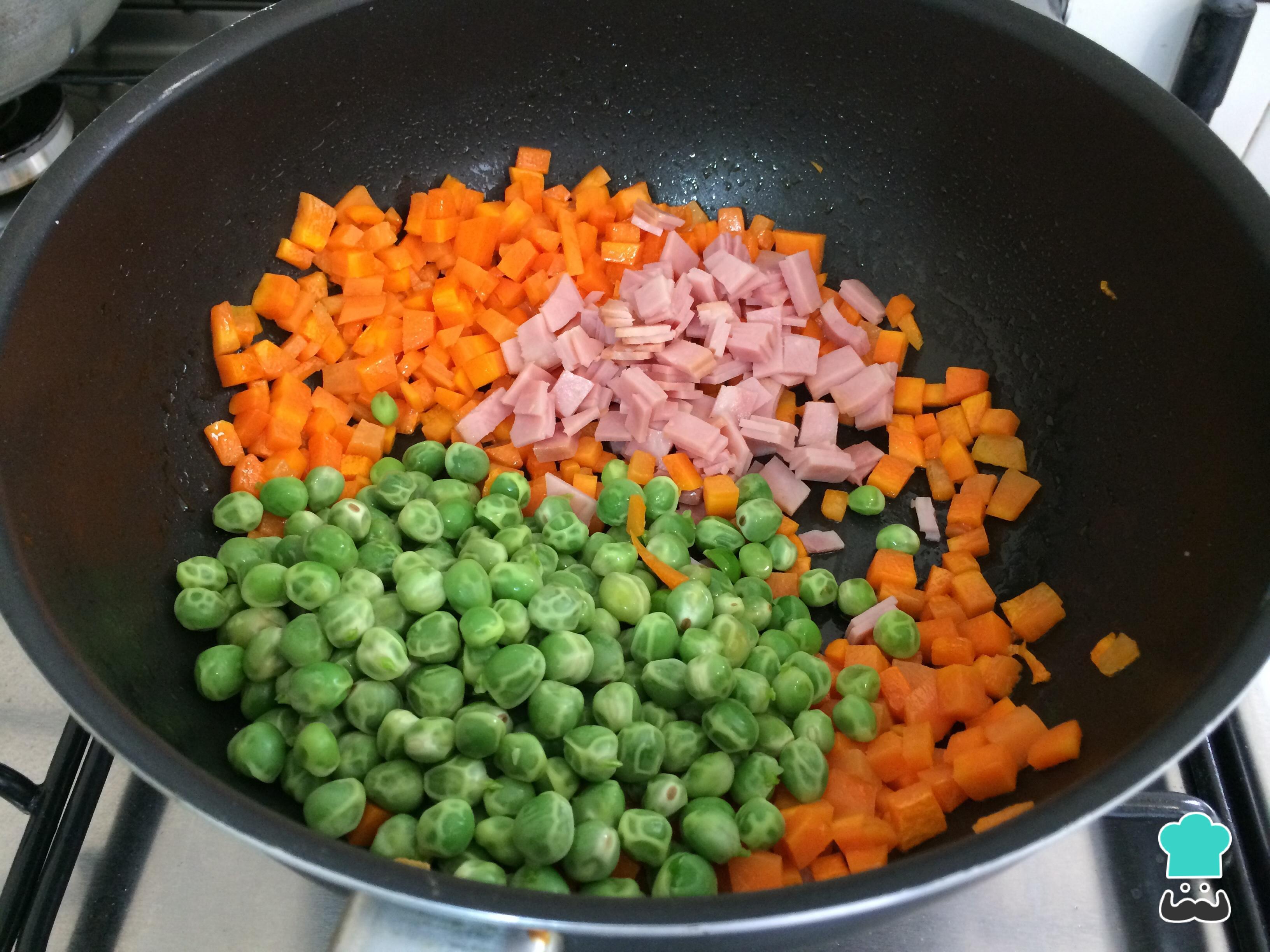 Adicione as ervilhas (previamente cozinhadas em água fervente por 10 minutos) e o presunto cortado em cubos pequenos. Salteie em fogo médio durante 5 minutos, tempere com sal e pimenta e reserve num prato à parte.