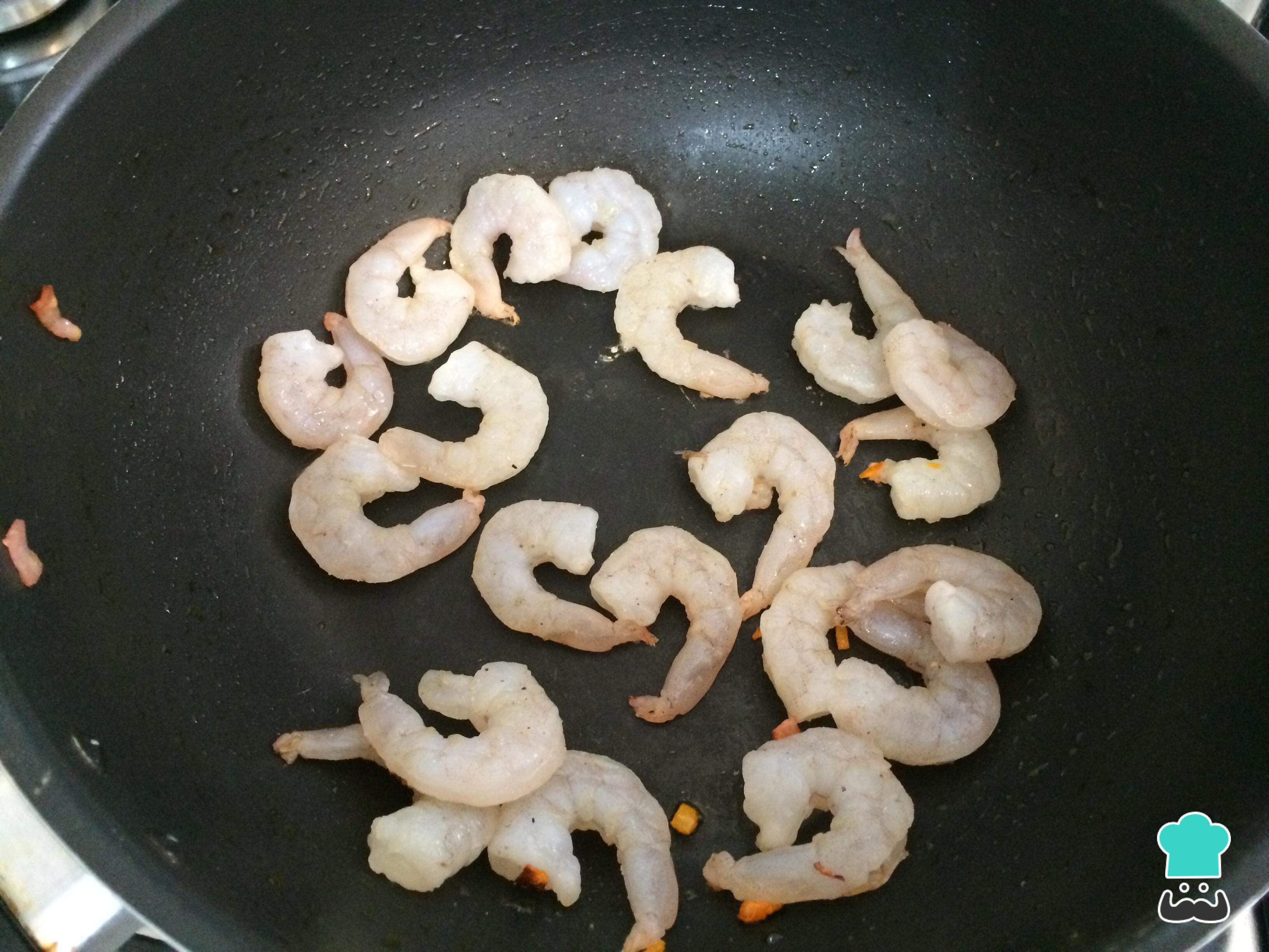 O passo seguinte desta receita de arroz frito com camarão e legumes é saltear os camarões na mesma frigideira durante 5 minutos, ou até que estejam rosados. Retire e misture com os ingredientes anteriores.