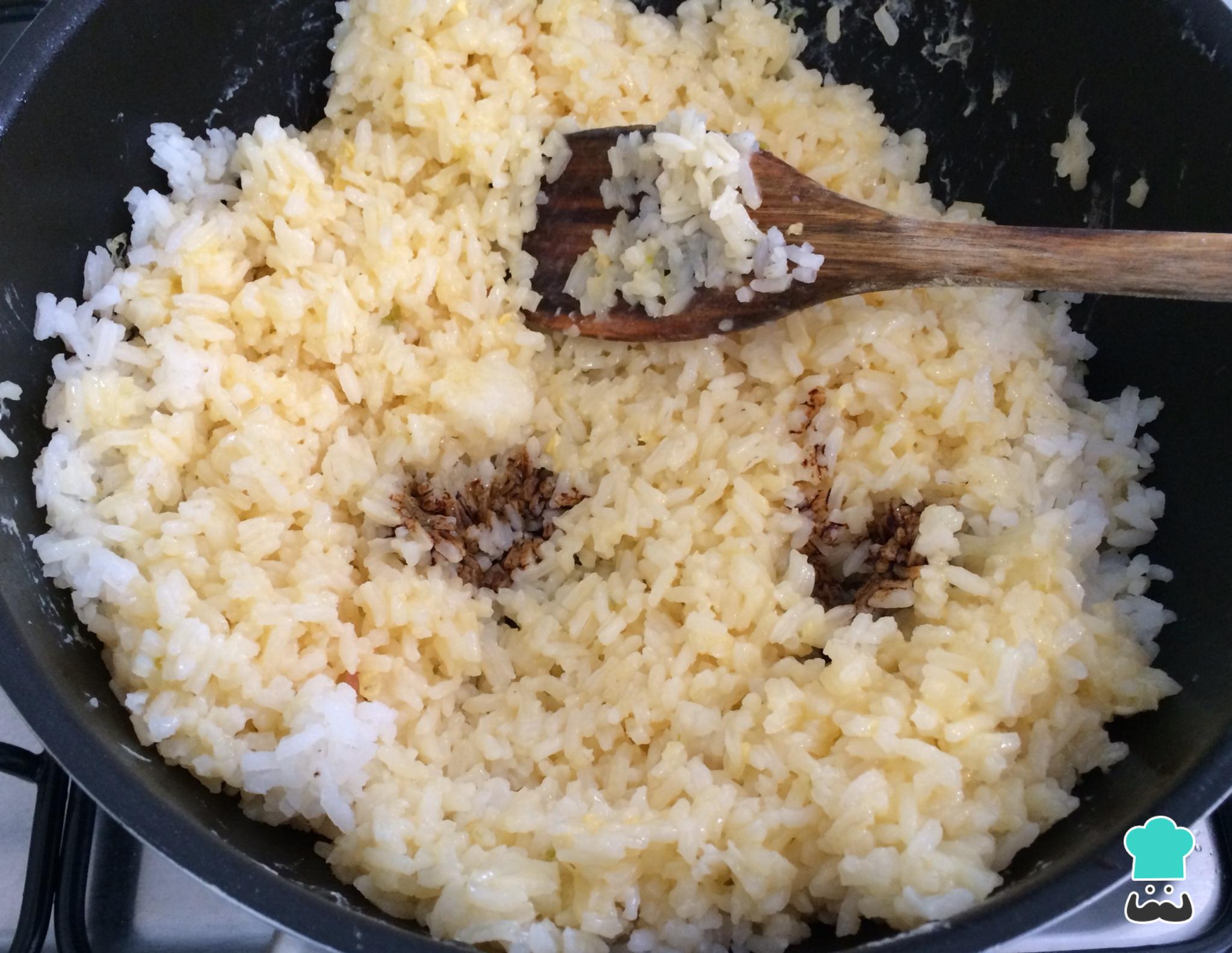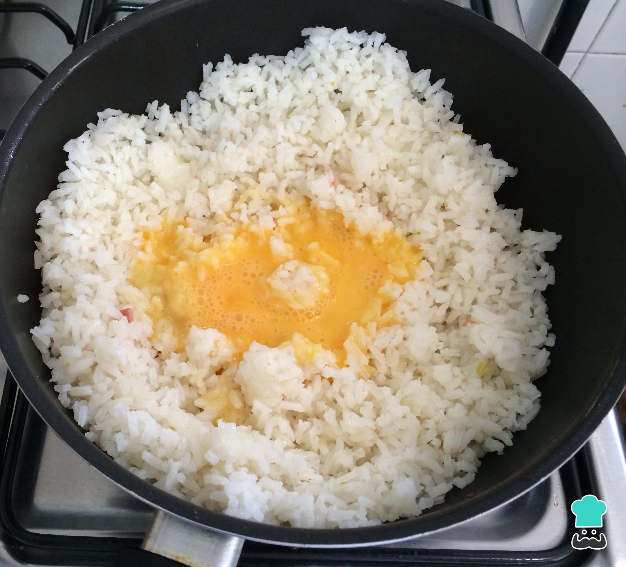 Adicione o arroz à frigideira e salteie durante alguns segundos, para esquentar. Adicione os ovos batidos e misture muito bem para que cozinhem.