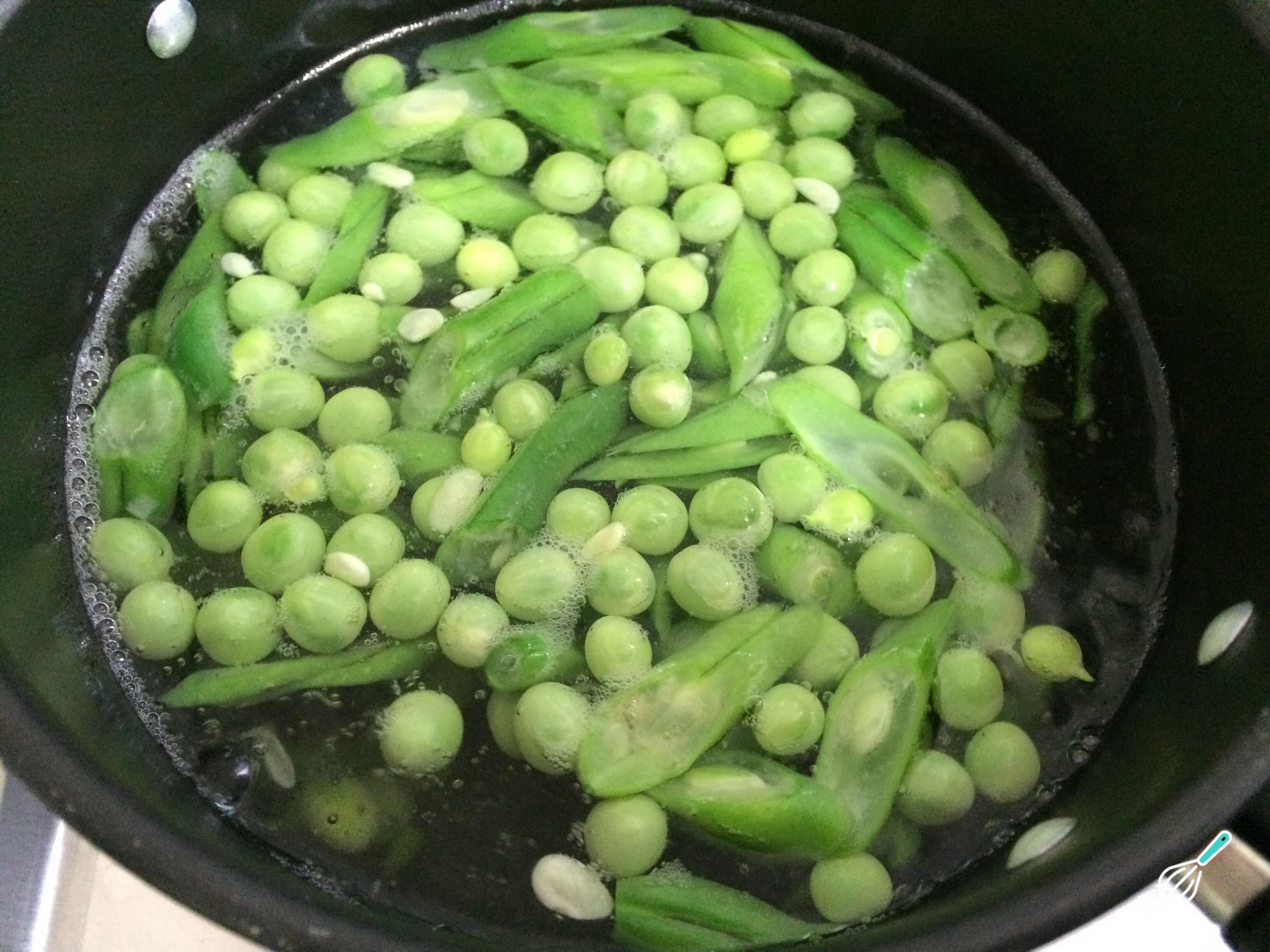Em uma panela de água fervente, cozinhe as ervilhas e a vagem por 10 minutos. No final desse tempo, escorra e reserve.