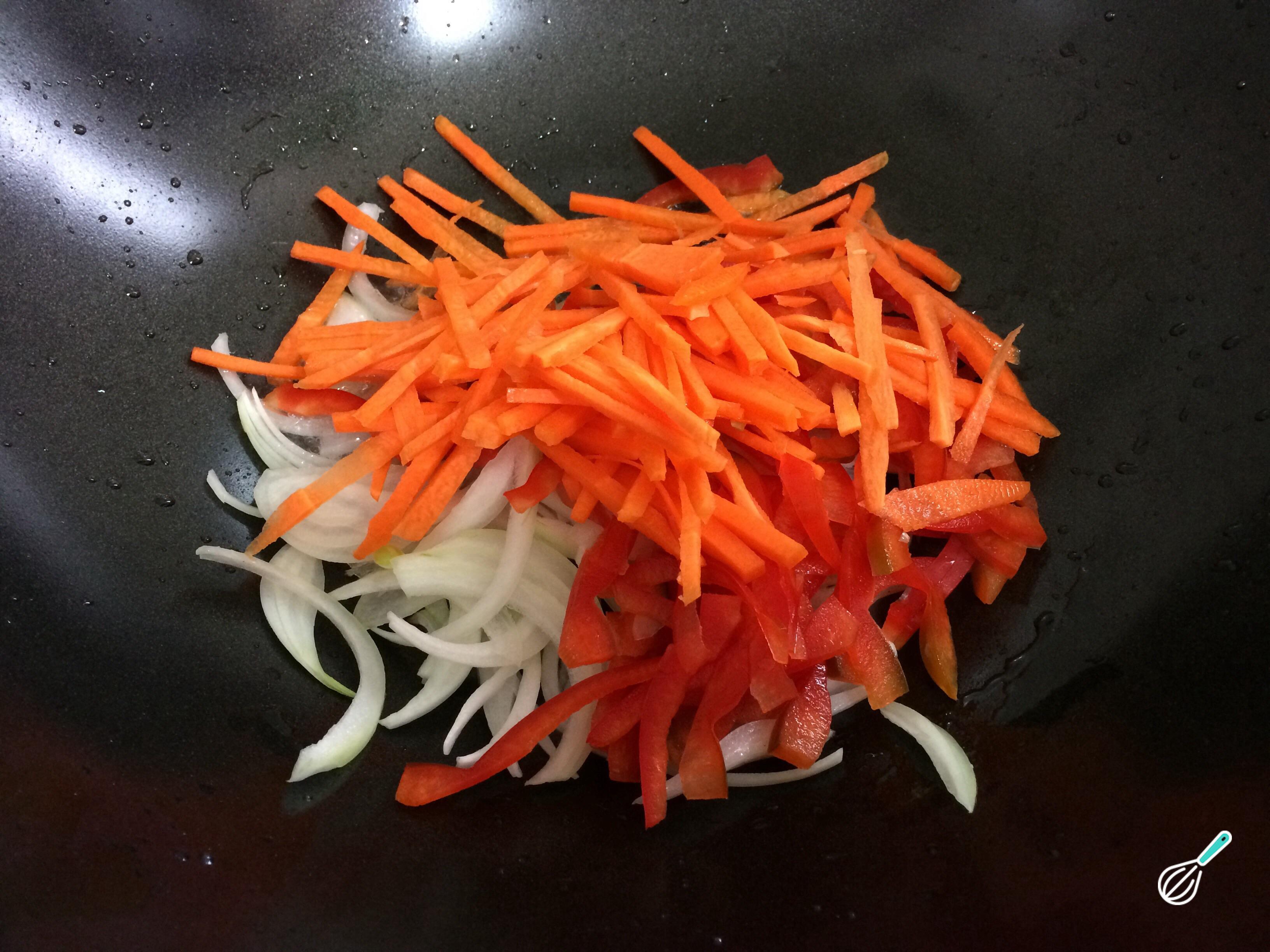 Em uma frigideira com o óleo, salteie a cebola, a cenoura e o pimentão vermelho por 5 minutos.